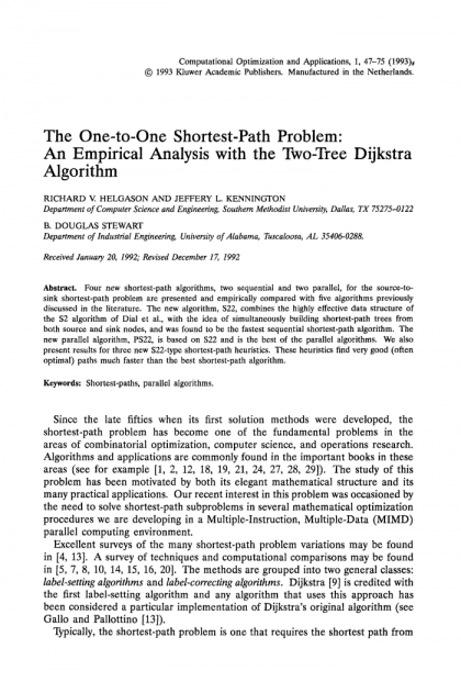 在[4,13]中可以找到关于许多最短路径问题变化的优秀调查。技术的调查和计算比较可以在[5,7,8,10,14,15,16,20]中找到。这些方法分为两大类:标签设置算法和标签校正算法。Dijkstra[9]被认为是第一个标签设置算法,使用这种方法的任何算法都被认为是Dijkstra原始算法的特定实现(参见Gallo和Pallottino[13])。