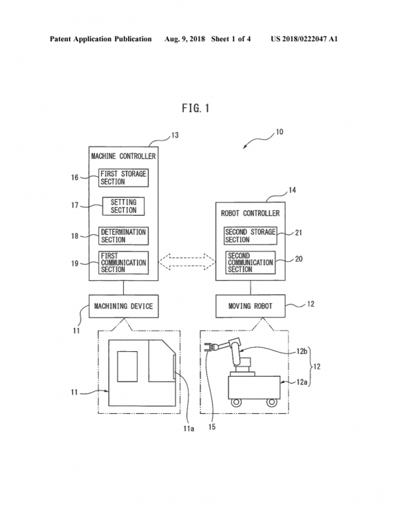 或者,也可以在移动机器人12是自动移动机器人的情况下,将从上述的移动到预定的第一位置的信号从机器人控制器14发送到机械控制器13,并且确定部分18基于该信号确定移动机器人12被布置在预定的第一位置。