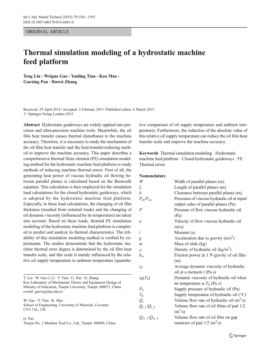 本文提出了一种流体力学平台的热有限元仿真建模方法,分析了其热特性。这种方法考虑了油膜传热和供油温度相对于环境的温度,以及这种传热规模对机器造成的热误差。本文的结构安排如下:第2部分介绍了静压机床进给平台热模拟建模程序的必要理论准备。所讨论的热建模的粘性液压油平行的平面之间的流动施加到所需的模拟负载计算。然后,在第3节的基础上,在各种工况下,实现了静压机床进给平台的热有限元仿真建模。在第4节中,通过实验方法验证了静液机进给平台有限元仿真建模方法的可靠性。此外,基于仿真建模结果,第5节系统分析了静液压机床进给平台的热误差与其工作状态(供油温度和环境温度)的关系。最后,在第6节对论文进行了总结。