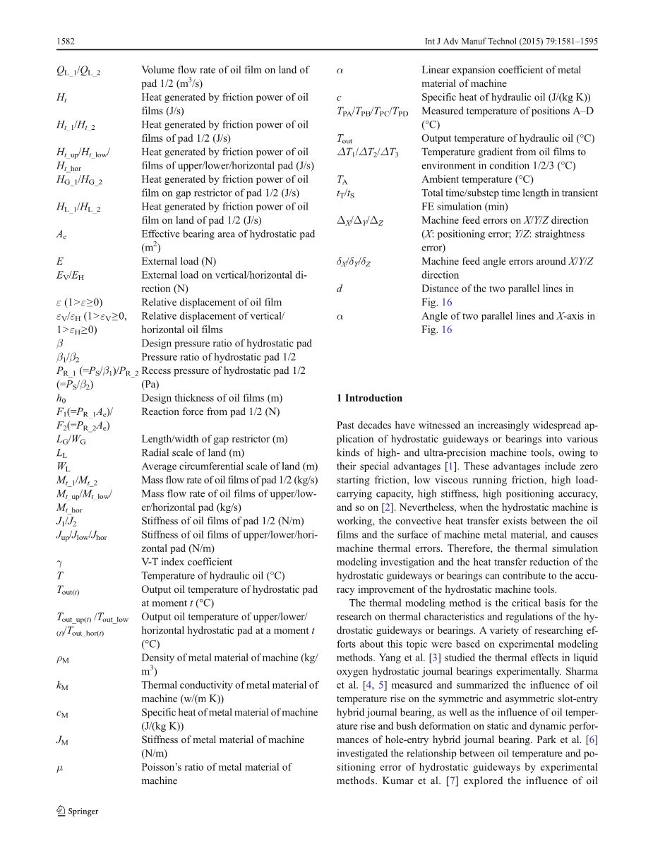 热建模方法对静压导轨和轴承的热特性和规则研究的基础和关键。各种研究关于这个话题是基于实验建模方法。杨等人[ 3 ]实验研究了液态氧静压轴承的热效应。夏尔马等[ 4,5 ]测量和总结了油温上升对对称和非对称槽形混合滑动轴承的影响,以及油温升和布什变形对开孔混合滑动轴承静态和动态性能的影响。Park等人[ 6 ]研究了静压导轨油温度和定位误差之间的实验方法。库马尔等人利用实验方法探讨了油温升和布什变形对动静压轴承稳定裕度的影响。铃木等[ 8 ]对油润滑静压轴承高精度机床的两种热变形进行了对比分析。这些实验建模活动是很有价值的在认识静压导轨和轴承的热特性。然而,他们缺乏关于静水传热和然后讨论,难以在机床设计阶段进行预测和分析静压导轨或静压轴承的热特性。