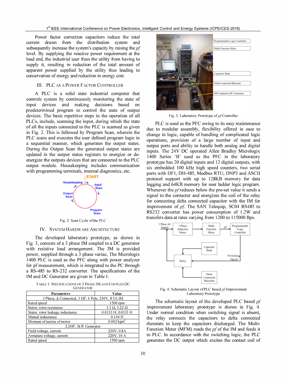 PLC之所以能用做功率因数控制器的原因是它经过模块化组装易于维护、灵活易于改变逻辑,同时他能够处理复杂的逻辑操作,为用户提供了大量的输入和输出端口并具有处理模拟和数字输入的能力。在实验室原型中用作功率因数控制器的24V直流工作的Allen BradJey Micrologix 1400 B系列的PLC具有20个数字输入和12个数字输出接口、具有6个嵌入式100kHz高速计数器、两个支持DFI, DH-485,Modbus RTU ,DNP3和ASCII协议的串行端口、具有128KB的内存用于数据记录以及64KB提供给用户进行梯形逻辑程序编写的内存。每当功率因数低于预设值时,它会向接触器发送信号并给继电器的线圈供电,用来使三角形连接的电容器连接到感应电动机中,以此来改善功率因数。SAN Telequip,SC04 RS485-RS232转换器会有1.2W的功耗但数据传输速度可达到1200-115000bps。