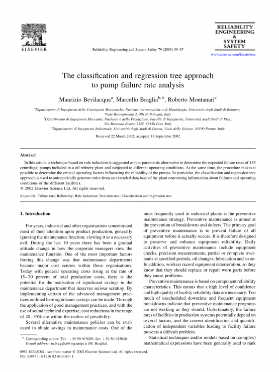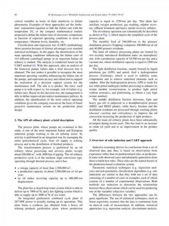 分类和回归树(CART)方法显示出了相对于标准统计技术的明显优势。本文对意大利某重要炼油厂143台离心泵的主要工况失效率进行了辨识。根据CART方法进行分析。采用这种方法,在对历史泵故障数据进行分析后,得到最终决策树。这种树使得识别影响泵故障率的最重要的操作变量成为可能,并代表了支持维护人员决策支持系统实现的简单和强大的工具。目的是预测每个泵的类别,例如故障风险(例如故障率)。基于此决策树,管理层能够定义改进的预防性维护策略。此外,最关键操作条件的确定为公司主管提供了未来对生产工厂设计采取主动维护措施的基础。