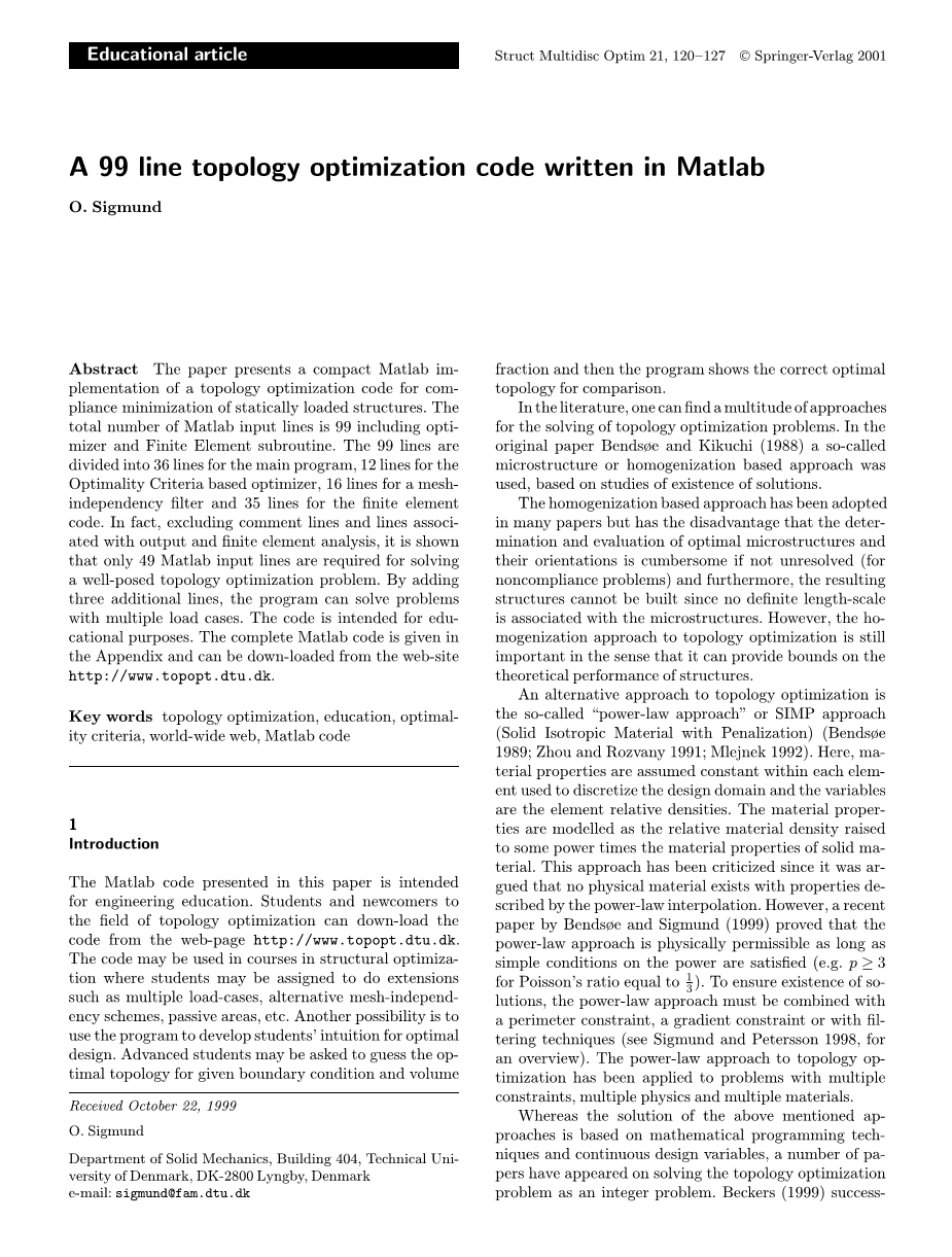 本文给出的Matlab程序是为工程设计教学而设计的。拓扑优化领域的学生和新手可以从网站http://www.topopt.dtu.dk上下载代码。该代码可用于结构优化的课程,课上学生可以被安排进行扩展,如多个荷载工况、可替代的网格独立方案、无源区域等。另一种可能是利用这个程序来培养学生的直觉,从而进行优化设计。可以要求高等的学生猜测在给定边界条件和体积分数下的最佳拓扑,然后与程序运行得到的正确的最佳拓扑做对比。