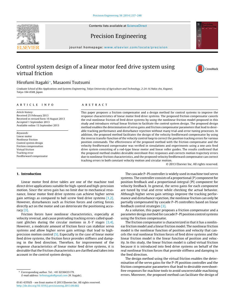 关键词:直线电机,非线性摩擦,控制系统设计,摩擦补偿,虚拟摩擦,跟踪误差,