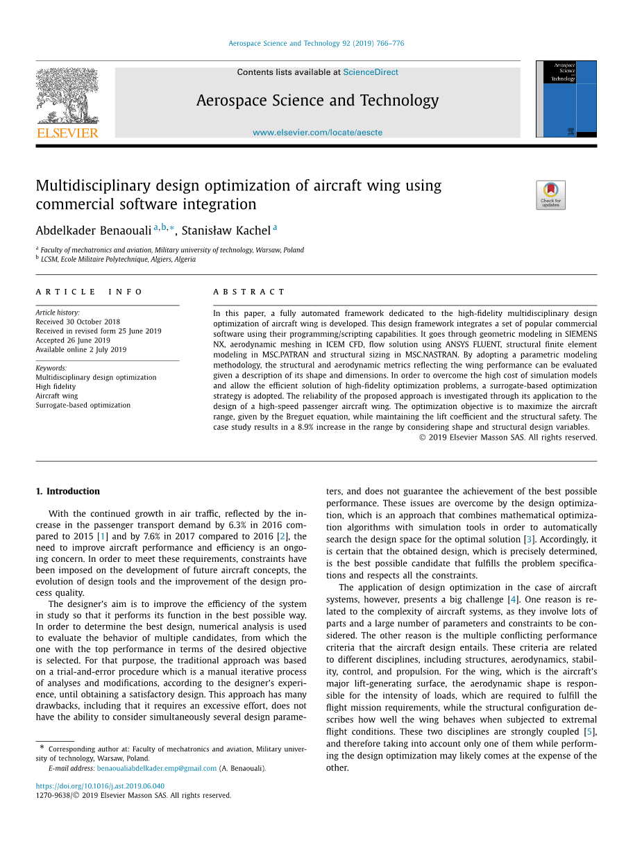 关于飞机设计领域最新进展的文献调查,涉及基于单学科或多学科优化方法的研究,使用低或高保真模型,指出数值优化在飞机机翼结构设计中的应用一直是一个单一的学科,部分/全部基于低保真方法,或完全基于高保真模型,但使用的内部代码不可公共使用。本文提出了一个通用设计框架,旨在评估飞机机翼结构和气动性能。该方法的复杂性和强大之处在于它完全基于使用知名商业软件的高保真模型。整个建模和计算过程是以全自动化的方式执行的。为了降低仿真成本,开发的框架与代理建模技术相结合,为解决MDO问题提供了一个有效的环境,通过将该程序应用于计算空客A320级高速客机的最大航程,证明了该程序的功能性。