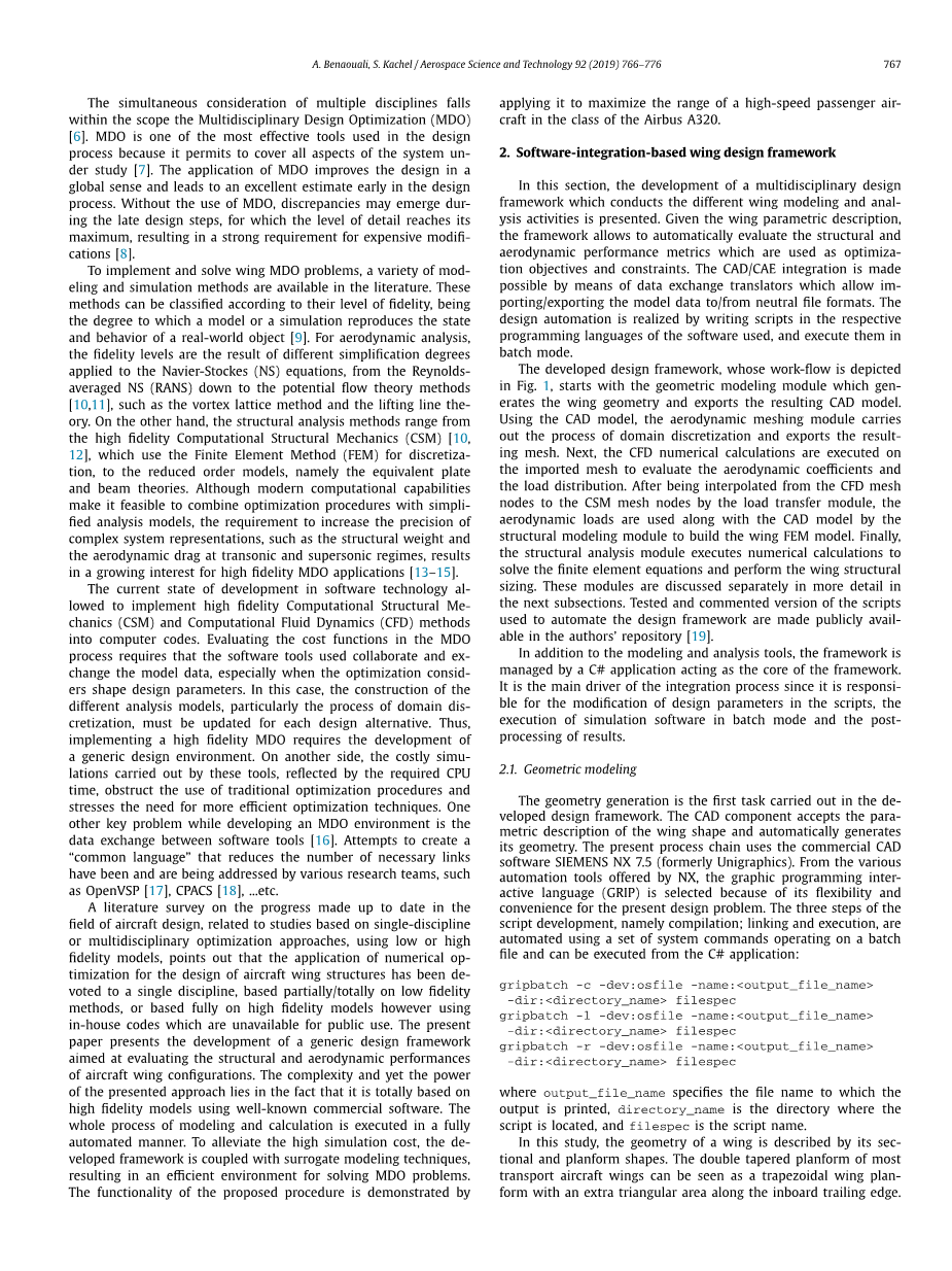 在这一部分中,提出了一个多学科设计框架的开发,该框架可以进行不同的机翼建模和多样化的分析。在给定机翼参数描述的情况下,该框架允许自动评估结构和空气动力性能指标,这些指标用作优化目标和约束。CAD/CAE集成是通过数据交换转换器实现的,该转换器允许将模型数据导入/导出到中性文件格式或从中性文件格式导出。设计自动化是通过用所用软件的相应编程语言编写脚本并以批处理模式执行来实现的。