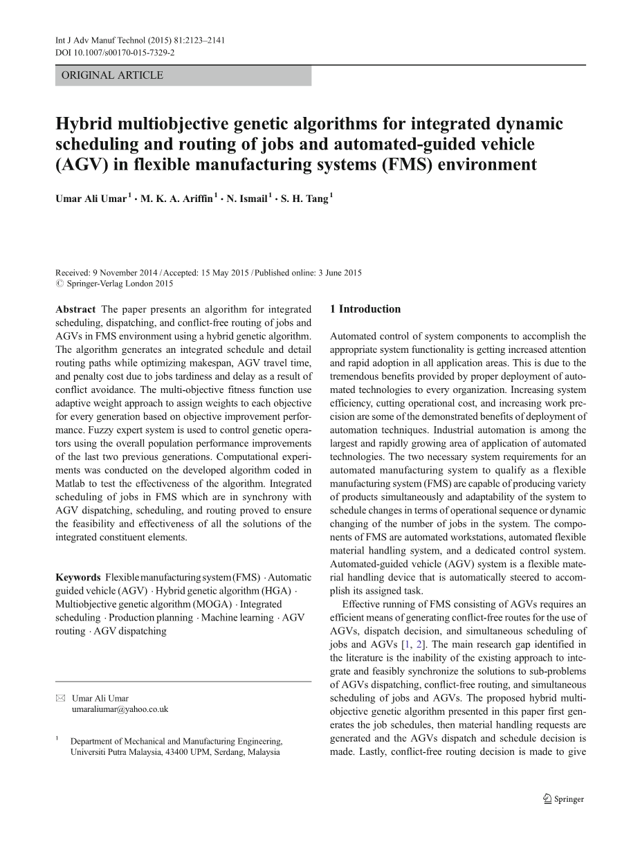 本文提出了一种使用混合遗传算法在FMS环境中对作业和AGV进行集成调度和无冲突进程的算法。该算法可生成集成的计划表和详细的进程路径,同时优化工期,AGV行驶时间以及减少由于避免冲突而造成的工作拖延和延迟而导致的损失成本。多目标适应度函数使用自适应权重方法根据目标改进性能为每一代的每个目标分配权重。模糊专家系统用于控制遗传算子,使用前两代的总体种群性能改进。对用Matlab编码的已开发算法进行了计算实验,以测试该算法的有效性。事实证明,FMS中与AGV的调度,调度和进程同步的作业的集成调度可以确保集成组成元素的所有解决方案的可行性和有效性。