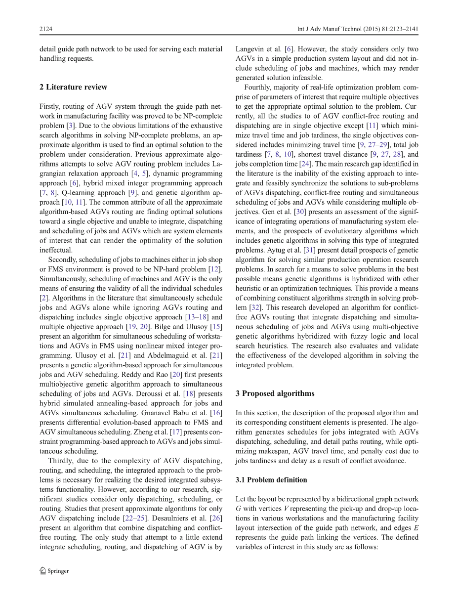 第三,由于AGV调度,进程和调度的复杂性,解决问题的集成方法对于实现所需的集成子系统功能是必需的。但是,根据我们的研究,重要的研究仅考虑调度,调度或进程。提出仅适用于AGV调度的近似算法的研究包括[22-25]。 Desaulniers等提出了一种结合调度和无冲突进程的算法[26]。唯一尝试稍微扩展集成AGV的调度,进程和调度的研究是Langevin等[6]。但是,该研究仅考虑了简单生产系统布局中的两个AGV,并且不包括作业和机器的调度,这可能会使生成的解决方案不可行。
