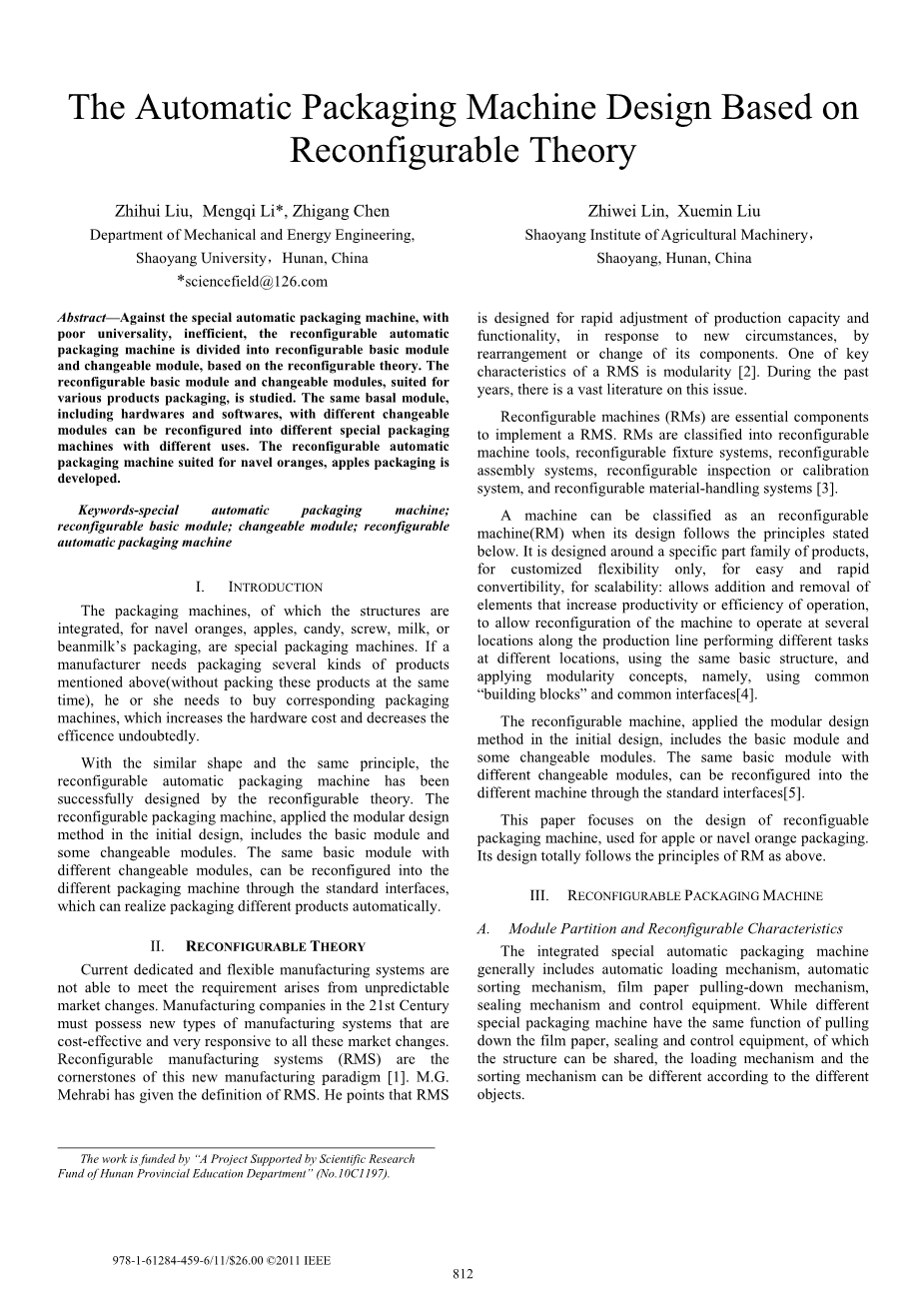 摘要——不同于通用性差、低效率的专用自动打包机,本文介绍了基于可重构理论设计的可重构自动包装机,其分为可重构基本模块和可变模块两部分。并且本文还研究了适用于不同种产品包装的可重构基本模块和可变模块。包括硬件和软件在内的同一种基本模块,通过配置不同的可变模块,可以重新配置成具有不同用途的特殊包装机。目前已设计出适用于脐橙、苹果包装的可重构自动包装机。