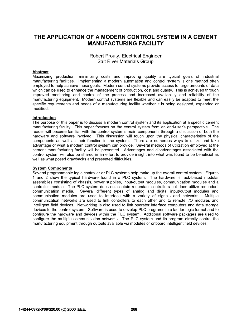 引言:本文的目的是来讨论现代控制系统,以及现代控制系统在特定水泥生产设施中的应用。本文会从最终用户的角度着眼于控制系统,对控制系统来进行讨论。通过讨论所涉及的硬件和软件,读者将会对控制系统的主要组件有所了解。该讨论会涉及到组件的物理特性,以及这些组件在系统中的功能,现代控制系统提供的功能可以充分应用到许多生产方法中。本文将介绍到水泥制造厂采用的几种生产方法,以及将会讨论到与控制系统相关的优缺点。通过对于控制系统有关的优缺点的讨论,我们既能认识到有益的一面,也能意识到存在的缺点和困难,从而去改进提高。