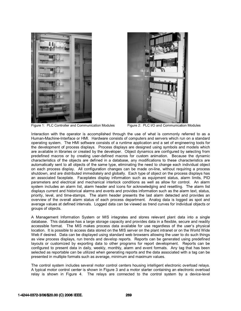 控制系统包括几个装有智能电子过载继电器的电机控制中心。一个典型的电机控制中心如图3所示,一个包含电子过载继电器的电机启动器如图4所示。继电器通过设备级别的通信网络连接到控制系统。继电器包含输入和输出点以及状态指示器。与输入/输出点关联的传统控制接线已由设备级别的网络通信电缆取代。可用的保护继电器功能包括过载、缺相、接地故障、失速、卡纸、欠载、电流不平衡和通信故障。参数可用于配置和监视继电器。可编程参数用于配置保护功能、网络设置和输出点行为。监视的参数可提供有关相电流、警告和跳闸信息以及机载输入和输出点状态的数据。电机控制中心包含制造商组装的部分,其中装有PLC硬件和终端点。离散和模拟现场设备通过这些终端点和PLC硬件连接到控制系统。典型的离散设备包括限位开关、按钮、选择器开关,螺线管和喇叭。模拟设备包括诸如温度、压力、液位、重量、位置和速度变送器。