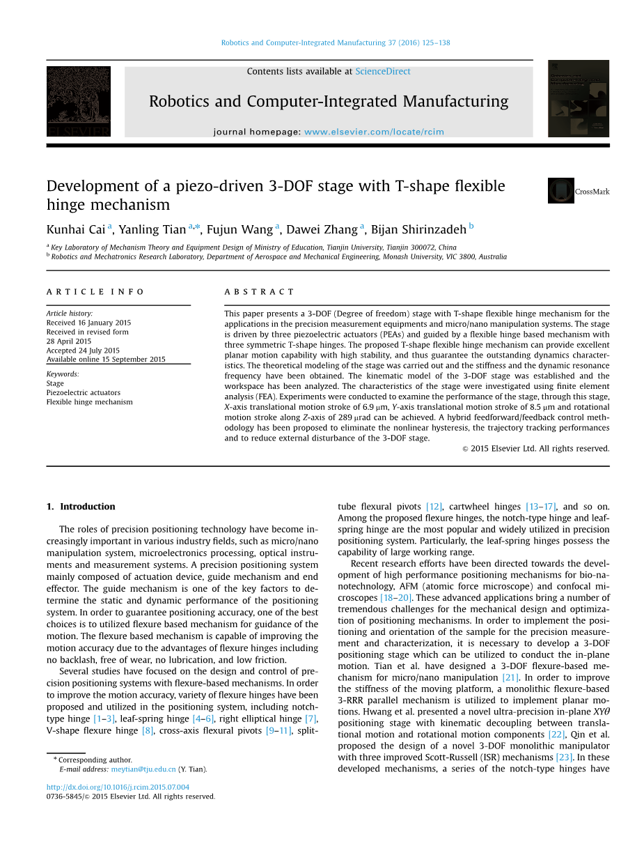 基于T型柔性铰链结构的压电驱动三自由度平台的研制外文翻译资料