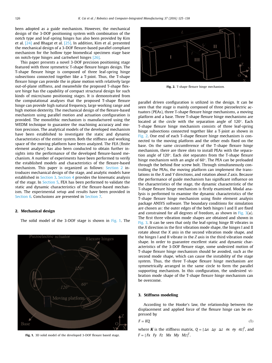 本文提出了一种新型的由三个均匀分布的T形弯曲铰链组成的三自由度精密定位平台的设计。T型柔性铰链是由三个簧片铰链像T型接头一样连接在一起构成的。因此,T型柔性铰链可以提供较大的面外刚度的平面内运动,同时所提出的T型柔性铰链具有使此类微/纳米级定位平台的结构紧凑的能力。计算分析表明,所提出的T型柔性铰链具有固有频率高、工作范围大、运动灵活性高等优点。给出了采用平行运动和驱动结构的柔性机构的结构设计。整体结构采用电火花线切割技术制造,保证了加工精度和运动精度。建立了该结构的解析模型,以便研究整个系统的静态和动态特性。分析了移动平台的刚度和工作范围。为了进一步了解所开发的基于柔性的结构的性能,还进行了有限元分析。为了验证所建立的模型和基于柔性的结构特性,进行了大量的实验。本文结构如下:第2节介绍了平台的结构设计,第3节建立了分析模型。第4节给出了平台的动力学分析。在第5节中,通过有限元分析验证了基于柔性的结构的静、动态特性。第6节介绍了实验装置和结果。第7节给出了结论。