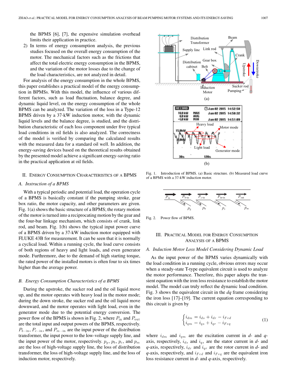 在典型的周期性和潜在负载下,如果给出了泵送冲程,齿轮箱比,电动机容量和其他参数,则BPMS的运行周期基本上是恒定的。图1(a)显示了BPMS的基本结构;电动机的旋转运动通过齿轮和由曲柄,连杆和横梁组成的四连杆机构转换为往复运动。图1(b)显示了由装有FLUKE-43B进行测量的37kW感应电动机驱动的BPMS的典型输入功率曲线。可以看出,这通常是周期性负载。在运行周期内,负载曲线既包含重负载也包括轻负载,甚至是发电机模式。此外,由于需要高启动转矩,因此安装的电机的额定功率通常比平均功率高四到六倍。