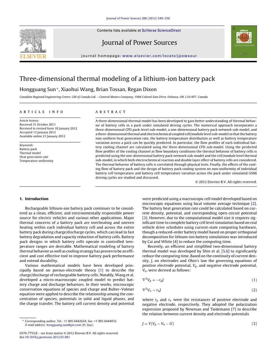 一个三维热模型已经发展到更好地了解电池的热行为的一个包下模拟行驶循环。它的数值方法采用了三维CFD包级子模型,一个一维的电池组网络子模型,和一个三维热和电化学耦合电池/模块级子模型,使得电池的非均匀发热率,电池温度可快速预测包装中的分布以及电池温度变化。特别地,使用三维CFD子模型计算每个单独电池冷却通道的流量分布。使用冷却通道的预测流动曲线作为流动边界条件,使用一维电池组网络子模型和电池/模块级热学子模型预测电池单元的热行为,其中电化学反应和双重考虑电池单元的层效应。电池单元的热行为通过物理测试相关联。最后,电池组冷却流的影响和电池组冷却系统的设计对非均匀性的影响 研究和讨论了在模拟的US06驱动循环下单个电池单元温度和电池单元温度变化的变化。