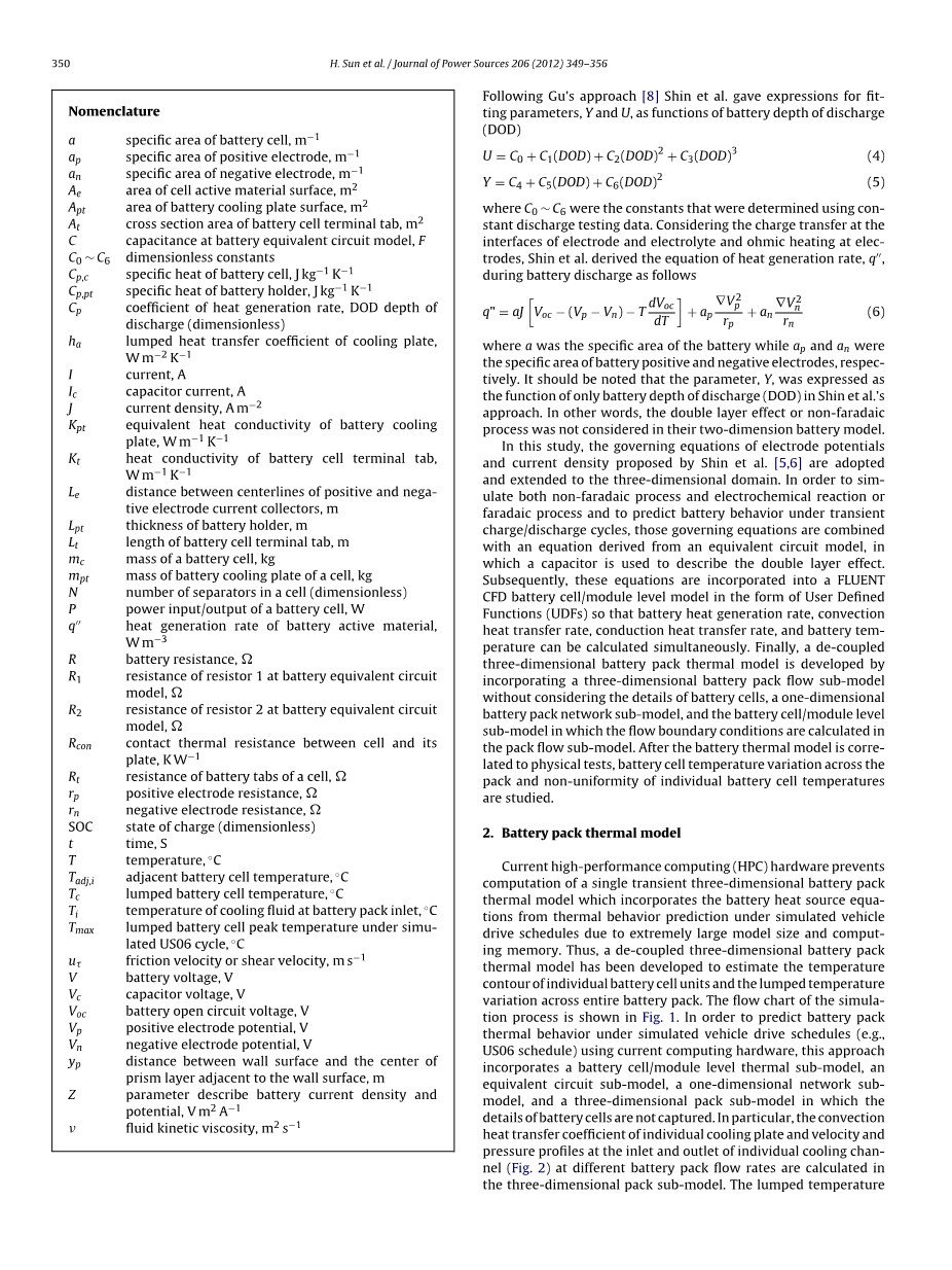 在这项研究中,Shin等人提出了电极电位和电流密度的控制方程。采用[5],[6]并扩展到三维域。为了模拟非法拉第过程和电化学反应或法拉第过程以及预测瞬态充电/放电循环下的电池行为,将那些控制方程与从等效电路模型得到的方程组合,其中使用电容器来描述双层效应。随后,将这些等式合并到FLUENT CFD电池单元/模块级模型中以用户定义功能(UDF)的形式,可以同时计算电池发热率,对流传热率,传导热传递率和电池温度。最后,通过结合三维电池组流动子模型开发去耦合三维电池组热模型,而不考虑电池单元的细节,一维电池组网络子模型和电池单元/模块级子模型,其中在包流子模型中计算流边界条件。在电池热模型与物理测试相关联后,电池组电池温度变化与不均匀性有关 ,究了各个电池温度。