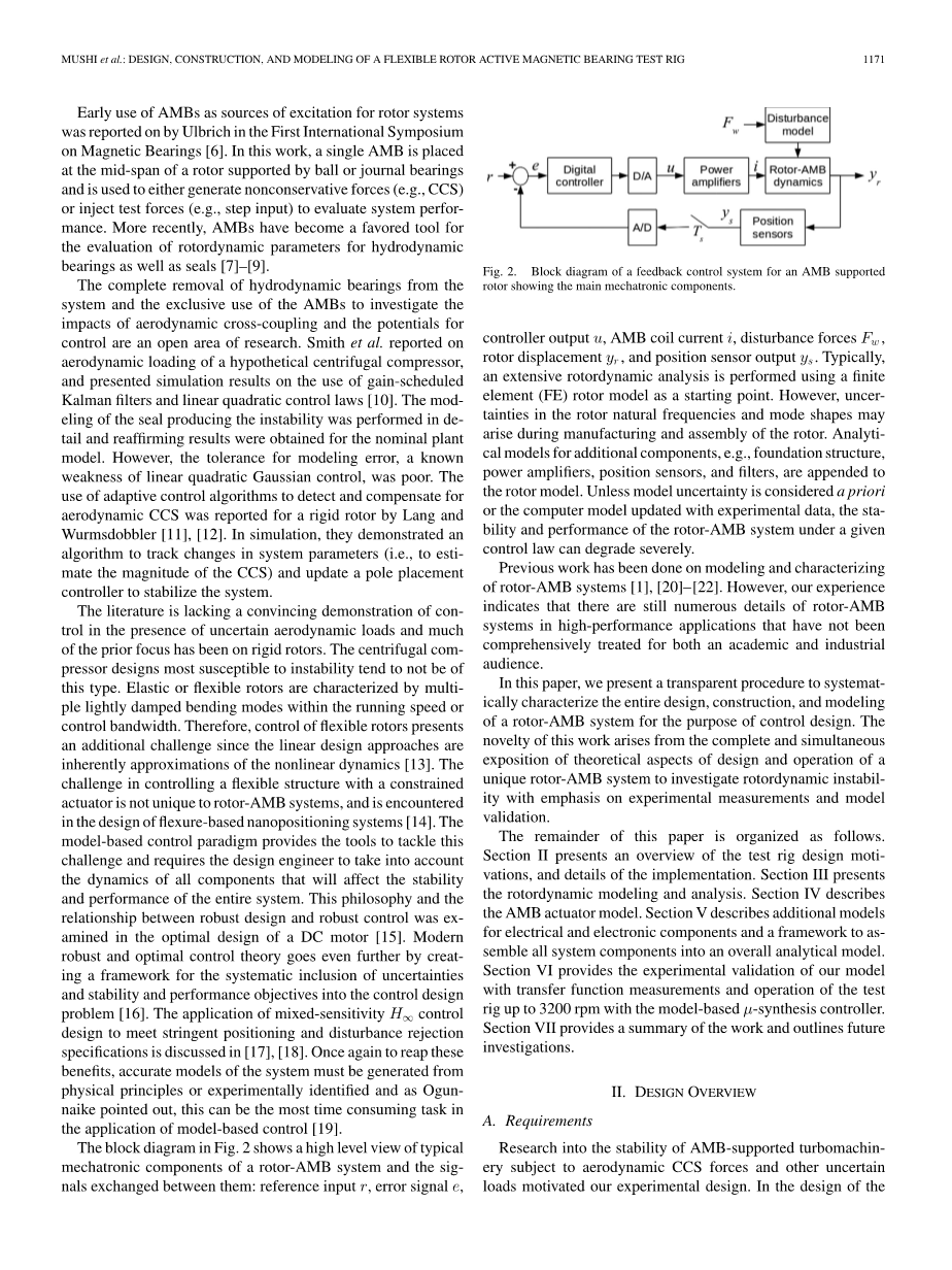 目前的文献缺乏有说服力的在不确定的空气动力载荷存在下的实验,大部分以前的文献重点一直在刚性转子。离心式压缩机的设计最容易产生不稳定的倾向,而不是这种类型的。柔性转子的特点是在运行速度或控制带宽中存在多个轻阻尼弯曲状态。因此,柔性转子的控制是一个新的挑战,因为线性设计方法本质上是近似的非线性动力学[13]。用受约束的执行器控制柔性结构的挑战不是主动磁力轴承—转子系统独有的,是在柔性设计中所遇到的基于纳米定位的系统[14]。基于模型的控制方法提供了一种解决这个挑战的工具,并要求设计工程师考虑所有组件的动态特性,这将影响整个系统的稳定性和性能。在直流电动机的优化设计中,这一理念与稳健设计和鲁棒控制的关系得到验证[15]。现代鲁棒性和最优控制理论,甚至进一步建立一个框架来解决包含不确定性、稳定性和目标性能的系统的控制和设计问题[16]。文献[17]和[18]对混合灵敏度控制设计在满足严格的定位和抗扰条件中的应用进行了说明。Ogunnaike指出准确系统模型必须从物理原理或实验上进行验证,这可能是应用控制模型最耗时的任务[19]。