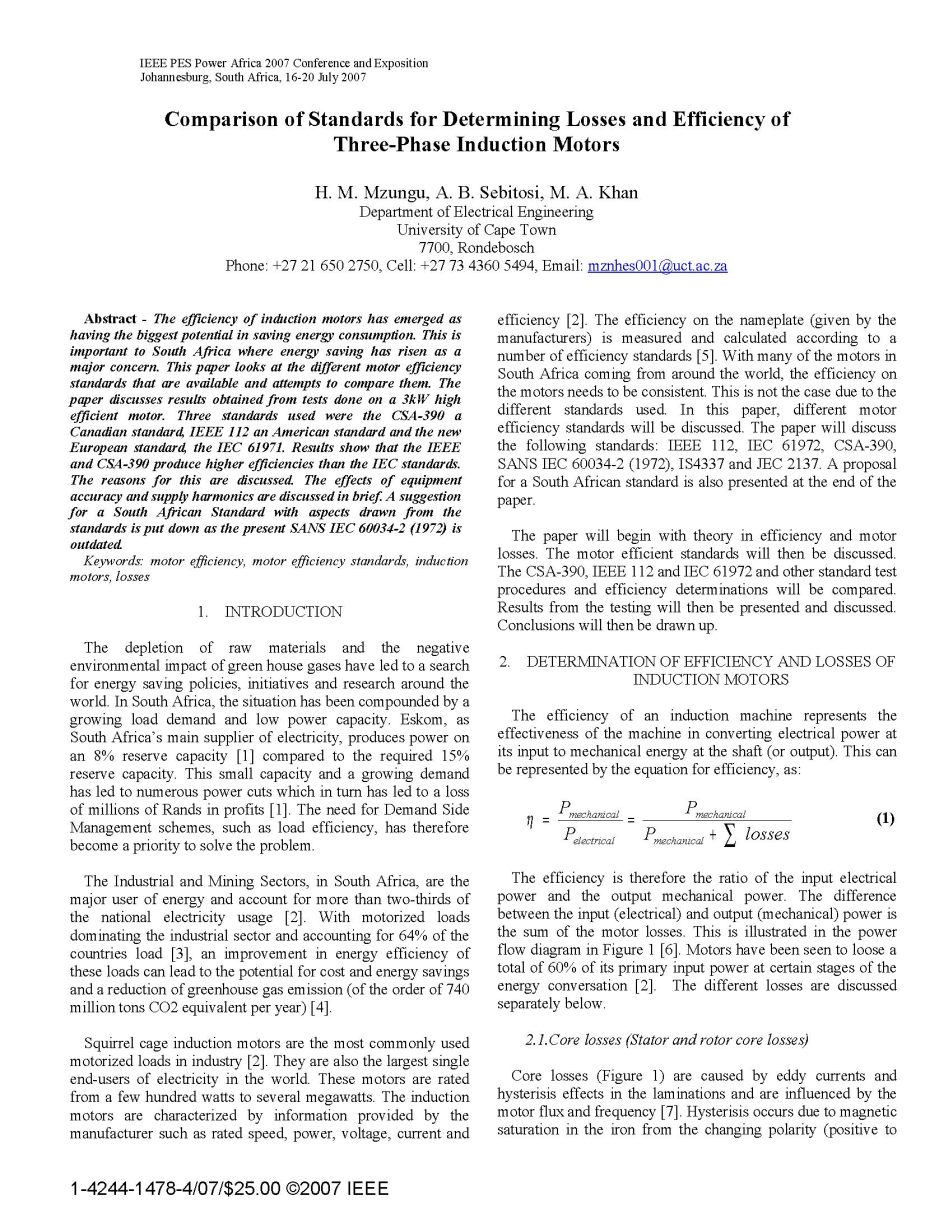 鼠笼式感应电动机是工业中最常用的电动负载。他们也是世界上最大的单用电终端用户。这些电机的额定功率在几百瓦到几兆瓦之间。感应电机的特点是参照制造商提供的信息,如额定转速,功率,电压,电流和效率。铭牌上的效率(由厂家提供)可以根据效率标准进行测定和计算。在南非,许多来自世界各地的发动机的效率需要一致。这不是由于不同的标准所使用的情况。在本文中,我将对不同的电机效率标准进行讨论。本文将讨论以下标准:IEEE 112,IEC 61972,csa-390,SANS IEC 60034-2(1972),is4337和JEC 2137。在文章结尾,我将提出对南非标准的建议。