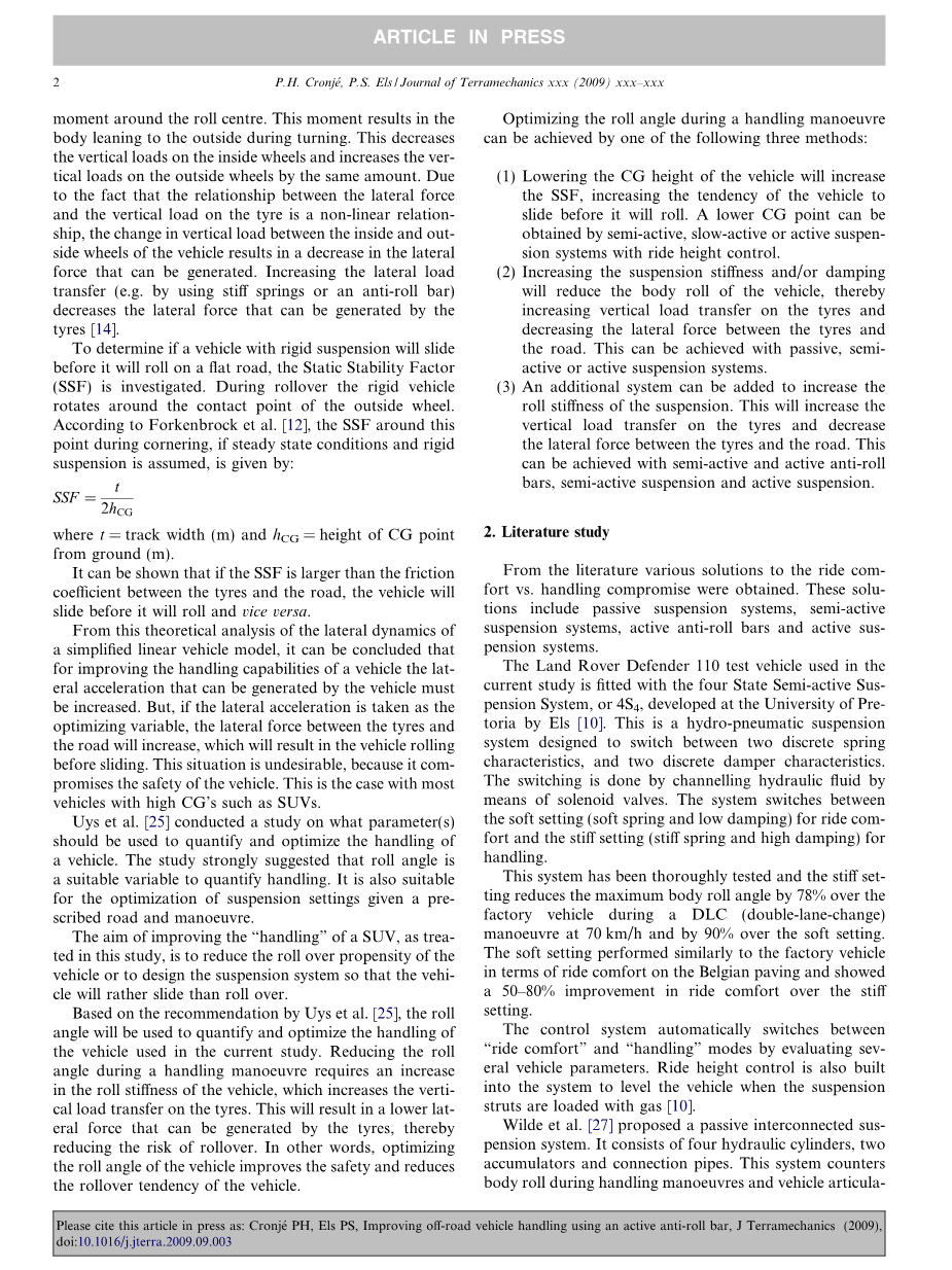 shuttlewood等人。[ 20 ]提出了一种非线性模型液压气动悬挂系统。悬挂支柱通过移动蓄能器和液压泵支柱之间的油来驱动。控制系统使用的横向加速度是通过系统响的应来确定的。只有模拟系统获得了结果。仿真结果未经实际测试验证。一个J-turn车辆通过实验模拟了0.8g的横向加速度。车身翻转角是对车辆操纵性的一个量化量。其中一个问题就是,当车辆进入转弯车身悬架表现出较低的振荡阻尼。这可以通过减少移动距离CG为0.6米的加速度计来实现所需。仿真结果表明,该系统在J-turn的演习结果中,80%都提高了车身的侧倾角。相似的解决方案是Packer[19], Tillback和Brodd [23], Darling和 Rosam [7] ,还有Hubert和Kumar [15]给出的。