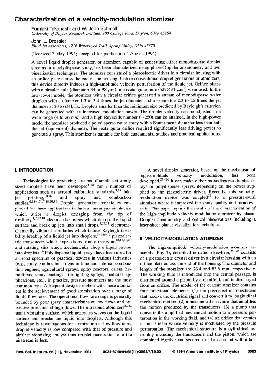 一种新型液滴发生器,或者也就是雾化器,能够生成单分散液滴流或多分散的喷雾, 特点是使用相位多普勒(phase-Doppler)风速测定和两个可视化技术。喷雾器包含一个压电驱动器,位于圆柱孔板内。与传统液滴发生器或雾化器不同,这个设备直接产生一个高振幅的速度受扰动的液体喷流。孔板有两种规格,一种是直径在34~98微米的圆孔,另一种是527x31微米的矩形孔。在低功耗模式下,圆孔雾化器产生一连串的单分散的水滴,液滴直径是喷射直径的1.5至3.4倍。在10-68khz的频率下,扩散系数在2.3至26倍。根据瑞利判据,可以推测在增加调制的情况下,液滴能够小于(已知的)最小的尺寸。液滴速度可调节范围广泛( 4 - 26 m / s),可适用的液体雷诺数可以高达250。在高功率模式下,雾化器产生的多分散的水喷雾索特平均直径不到喷射的(当量)直径的一半。相比较而言,对于同样的喷雾,矩形孔板需要的驱动力更小。本雾化器对于基础研究和实际应用都很适合。