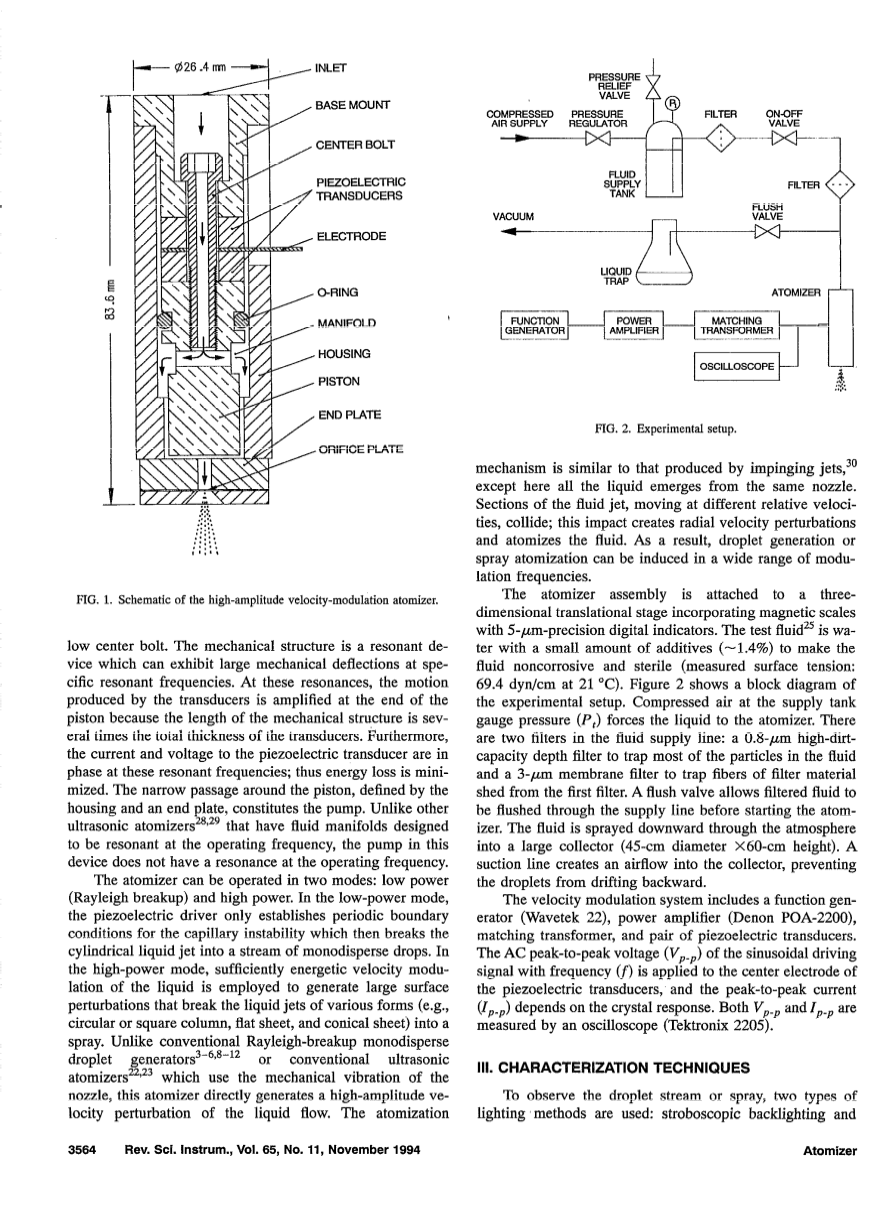 高振幅速度调制雾化器组件(图1),在别处详细描述的,由在横跨壳体两端的孔板的圆形外壳中的压电晶体的驱动。雾化器的直径和长度分别是26.4毫米、83.6毫米。引入中央通道的工作流体通过歧管分布在活塞的周围,从孔口排出。