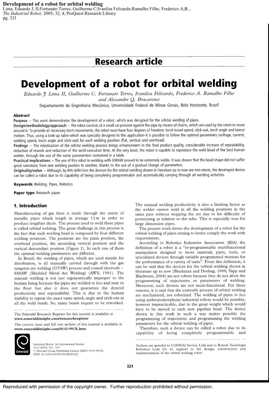 实践意义-在GMAW焊接使用这种机器人被证明是非常可行的。结果表明,由于渐变参数的使用,焊缝形状从一个焊接位置到另一个焊接位置没有出现很大的变化。
