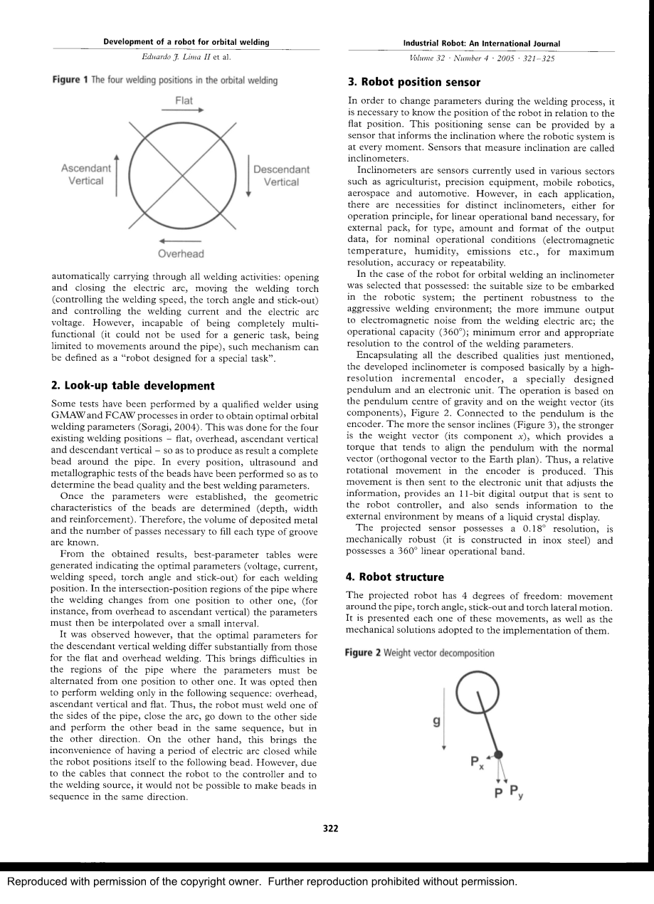因此,由于目前的焊接装置具有可编程的能力,并自动执行所有的焊接活动:打开和关闭电弧,移动焊枪(控制焊接速度,焊枪角度和伸出长度)和控制焊接电流和电弧电压,这种焊接装置可以被称为一个机器人。然而,由于不能完全实现多功能(因为被限制在管道周围,它不能用于一个通用的任务),这样的设计机制只能被称为“为一个特殊任务而设计的专业机器人”。