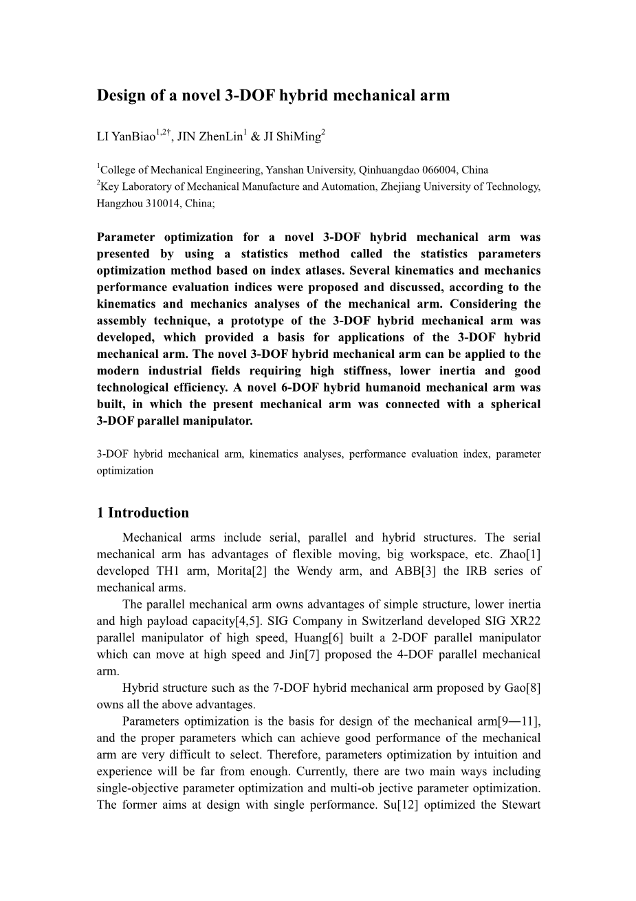 一种新型3-DOF混联机械臂设计外文翻译资料