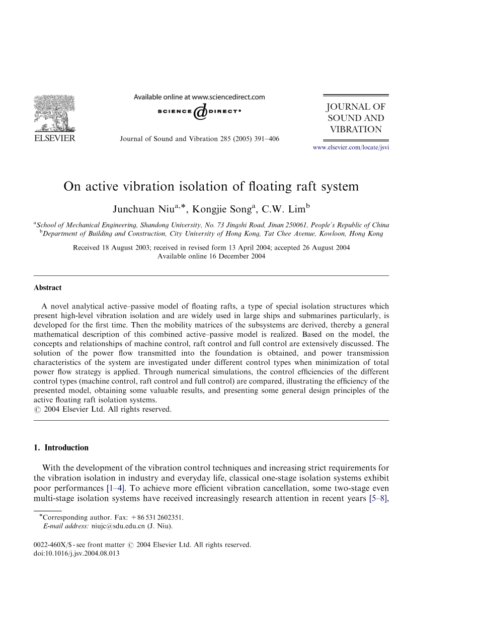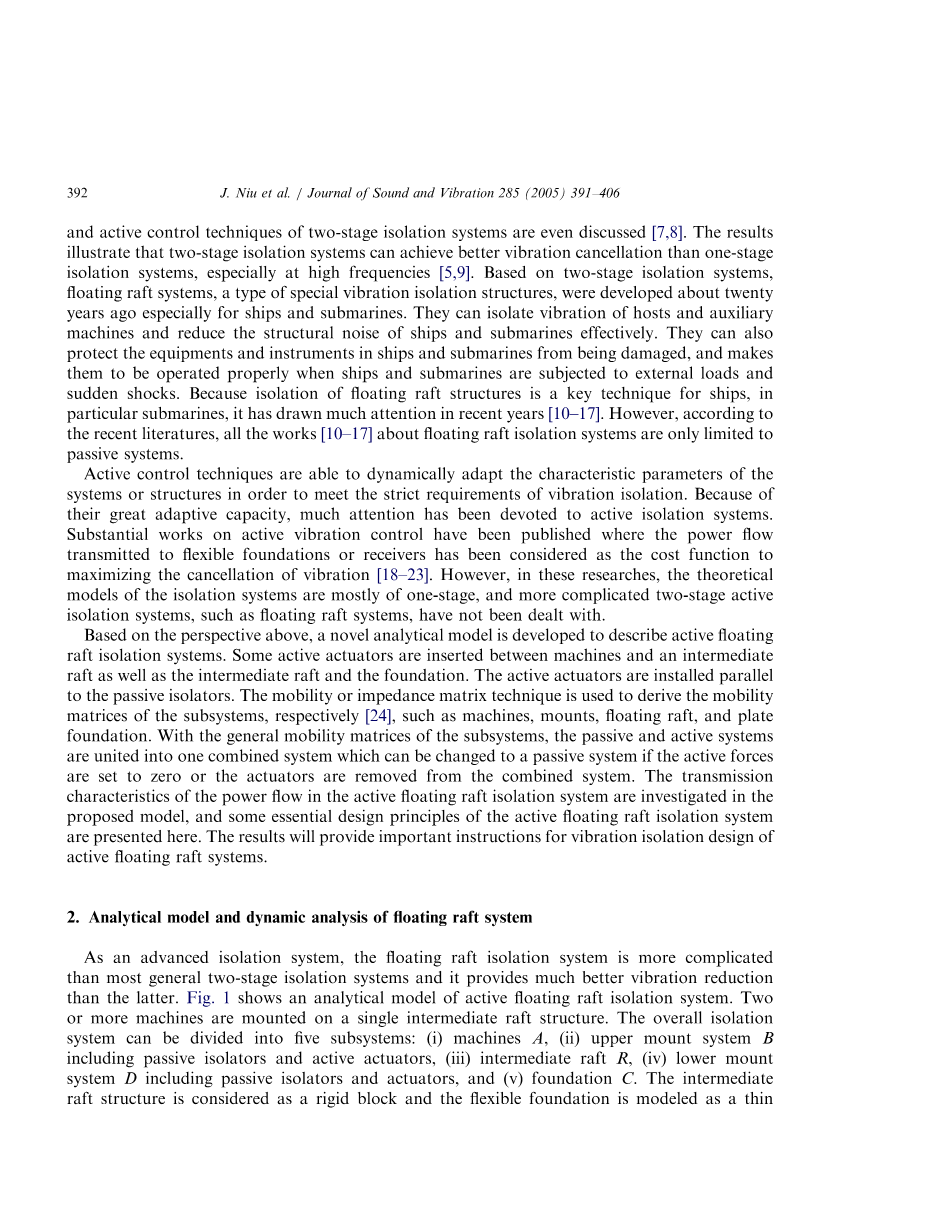 浮筏的一种新型主动被动分析模式,一种代表高水平隔振的典型隔离结构,特别是首次开发时被广泛应用于大型水面舰艇和潜艇上。然后派生出移动性矩阵的子系统,从而实现一种用数学描述来表达这种主被动结合在一起的模型。基于这种模型,对机器控制、筏控制和全控制的概念和关系进行了广泛讨论。功率流传输到基础上的解决方法已经被获得了。并且是在不同的控制类型下,当最小化总功率流已经被应用时,研究系统能量传输的特点。通过数值模拟,对不同的控制形式(机控制,筏控制和完全控制)的控制效率进行比较,表明主动浮筏隔振系统的提出的模型,获得的一些有价值的结果和提出了一些普遍的设计原则