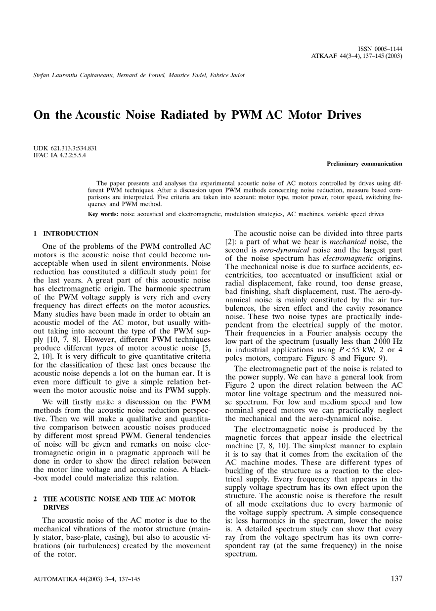 其中一个交流电动机控制的脉宽调变问题是当置于安静环境中,噪音可能变得令人不可接受。从去年开始,减轻噪音已成为一个研究难点。该噪音一个重要来源是电磁场。脉宽调变电源的谐波谱是非常充足的,每个频率对电动机噪音产生直接影响。为了获取一个交流电动机的声音模型,已经进行了众多研究,但是通常情况下,这些研究没有考虑脉宽调变电源【10、7、8】的类型。然而,不同的脉宽调变方法产生不同类型的电动机噪音【5、2、10】。因为噪音很大程度上取决于人类的耳朵,所以很难对噪音分类提出量化标准。甚至定义电动机噪音和它的脉宽调变电源之间简单的关系也更加困难。
