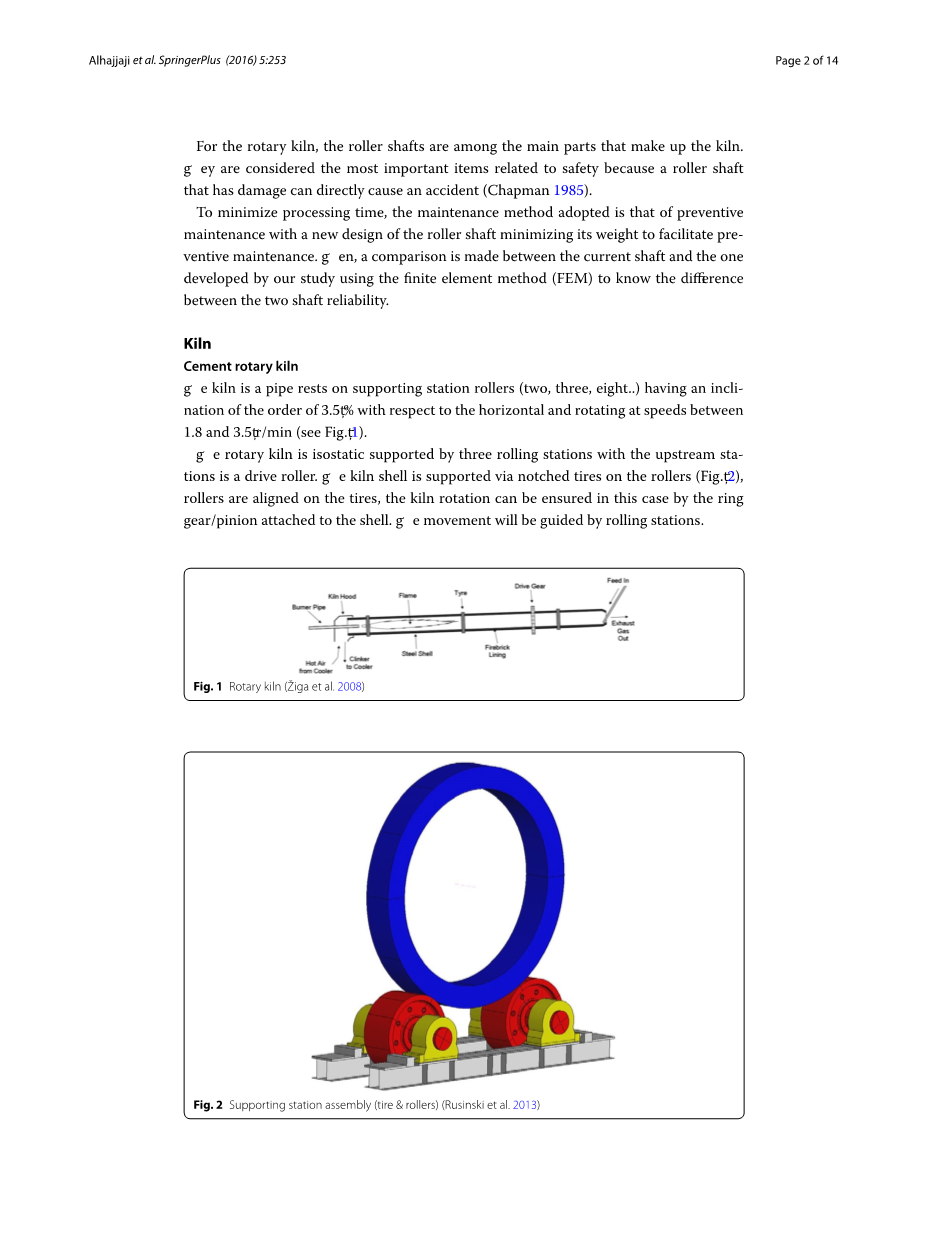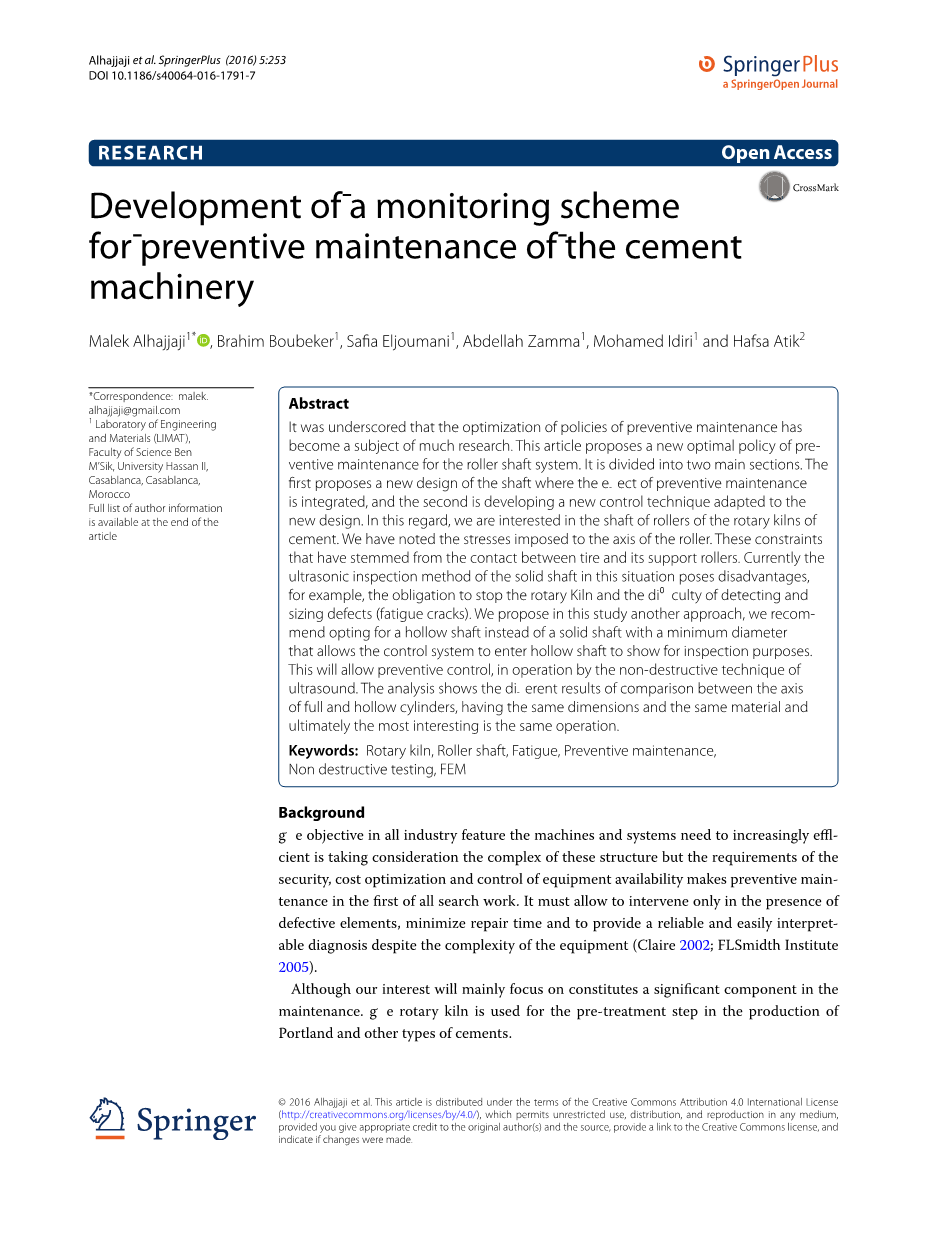 需要强调的是,预防性维修策略优化已成为很多研究的课题。本文提出了对拖轮轴系统预防性维护的一个新的最优策略,它被分为两个主要部分:第一部分提出一种预防性维修的效果集成于轴的一个新的设计,第二部分介绍的是正在开发一种适合这个新设计的新控制技术。在这方面,我们对水泥回转窑的托轮轴很感兴趣。我们已经注意到托轮轴所受的压力。这些约束力来自于轮带和托轮之间的接触。目前,检测实心轴的超声波探伤法有一些缺点,比如必须停窑检测,而且检测各种大小疲劳裂纹的难度很大。我们在本研究提出另一种方法,建议选择了一个空心轴,而不是具有最小直径的实心轴,达到允许控制系统进入空心轴来显示检查的目的。这可以将超声波无损探伤技术应用于预防性控制系统。本文的分析报告显示,在采用同样的尺寸、材料和操作运行下对比实心轴和空心轴后产生的不同结果。