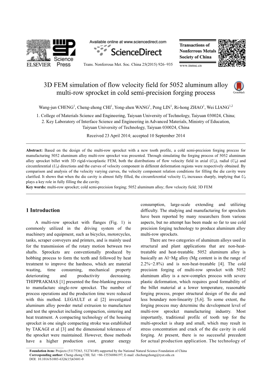 关键词:多排链轮;冷半精密锻造;5052铝合金;流动速度场;三维有限元。