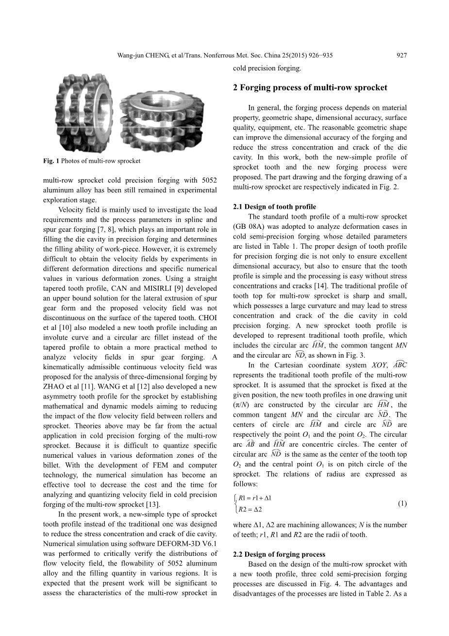 法兰多排链(图1)是普遍使用的机械设备的传动系统,如自行车、摩托车、坦克、刮板输送机和打印机,并主要用于轴间的回转运动的传动。链轮通常是由滚齿工艺形成的牙齿,然后通过热处理提高硬度,这种方式浪费材料,浪费时间,机械性能恶化,生产力降低。thipprakmas [ 1 ]提出的精冲工艺单排链轮制造。采用该方法处理工艺操作和生产时间减少。Legault等人[ 2 ]研究了铝合金金属粉末挤压制造和测试链轮包括压实、烧结和热处理。压实技术的房屋链轮在一个单一的密实的中风是由Takagi等人[ 3 ]和链轮的尺寸公差进行维护。然而,这些方法具有较高的生产成本,更大的能量消费,大规模推广和利用难度。研究和制造链轮受到来自各方面的许多研究人员的尝试,但没有尝试已经取得了迄今为止采用冷精锻技术生产的铝合金多排链轮。结构和植物应用中使用的铝合金有2类,非热处理和热处理。5052铝合金是铝镁合金minus;(Mg含量在2.2%minus;范围2.8%)和非热处理[ 4 ]。冷精锻多排链轮5052铝合金是一种严重的塑性变形的新的复杂的过程,它需要在一个较低的温度对坯料成形性能良好,合理的锻造工艺、模具的结构设计和不适当的边界非线性[5,6]。在一定程度上,锻造工艺可以确定多行链轮制造业的发展水平。最重要的是,多链轮的齿顶的传统齿形是尖锐的,这可能会导致在冷锻模具型腔的应力集中和裂纹。目前,没有实际生产应用成功的先例,。5052铝合金多排链轮冷锻工艺的试验研究还处于试验阶段。