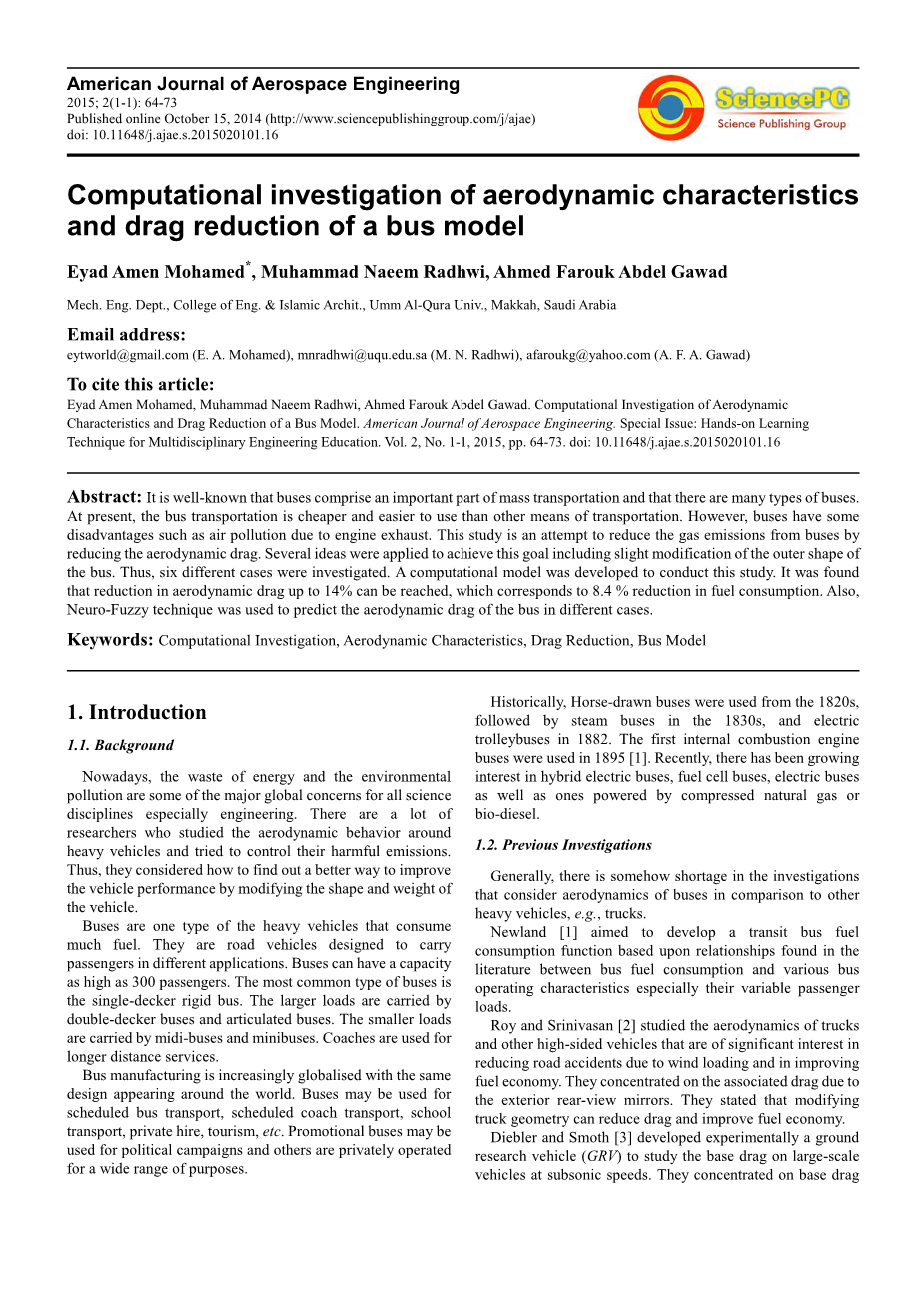 摘要: 众所周知,客车是大众交通的一个重要组成部分,客车有很多种类型。目前,客车比其他交通工具更便宜、更方便使用。然而,客车也有一些缺点,如发动机排气造成的空气污染。本研究旨在通过降低空气动力阻力来减少客车的气体排放。为了实现这一目标,人们运用了一些想法,包括对客车外部形状的轻微修改。因此,调查了6个不同的案例。为了进行这项研究,开发了一个计算模型。研究发现,空气阻力可以降低14%,相当于燃油消耗减少8.4%。同时,利用神经模糊技术对不同案例下的客车气动阻力进行了预测。