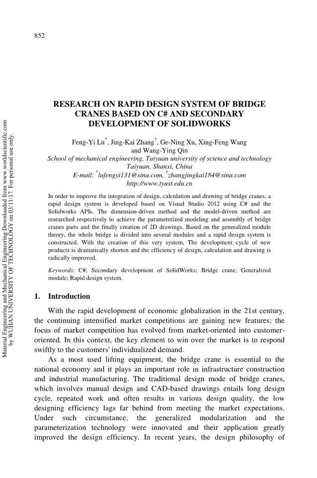 关键词:C#;SolidWorks的二次开发;桥式起重机;广义模块;快速设计系统