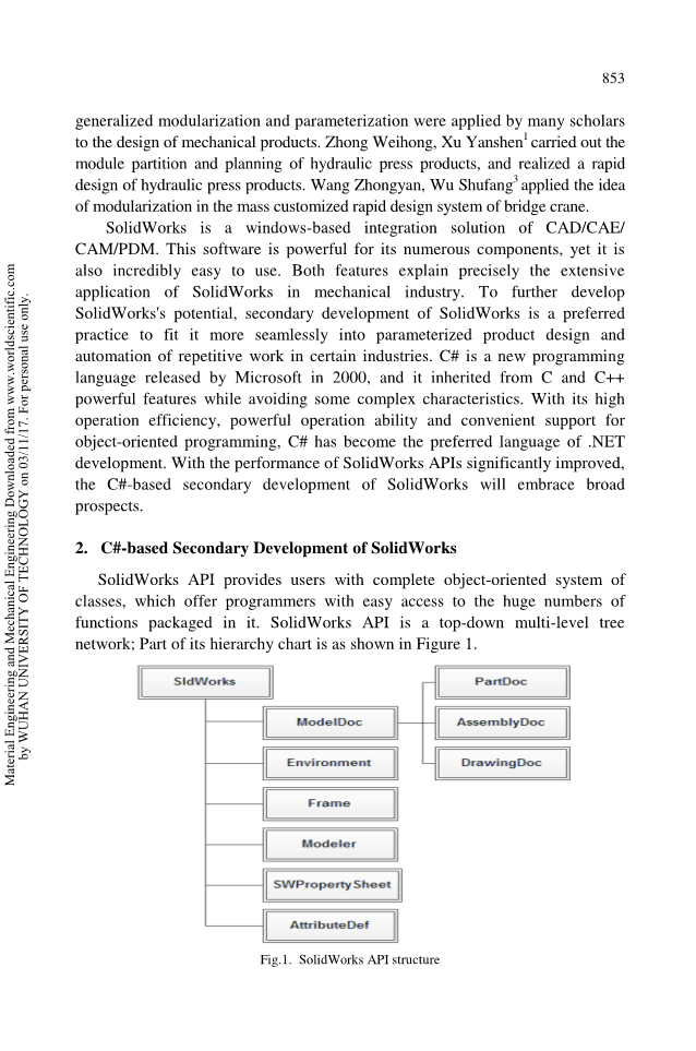 SolidWorks是一个基于Windows系统的CAD/CAE/CAM/PDM的集成解决方案。这个软件由于组件很多从而拥有强大的功能,但它使用起来十分简便。这两个原因得以解释SolidWorks为何在机械工业中应用得如此广泛。为了进一步发掘SolidWorks的潜力,SolidWorks二次开发是实现参数化产品设计和某些行业重复工作自动化的首选方法。C#是微软在2000发布的一种编程语言,它在继承了C和C 强大功能的基础上避免了一些复杂的特性。操作效率高,操作能力强,支持面向对象编程等优点使C#成为.NET发展的首选语言。随着SolidWorks API的性能显着提高,基于C#的SolidWorks二次开发将有广泛的前景。