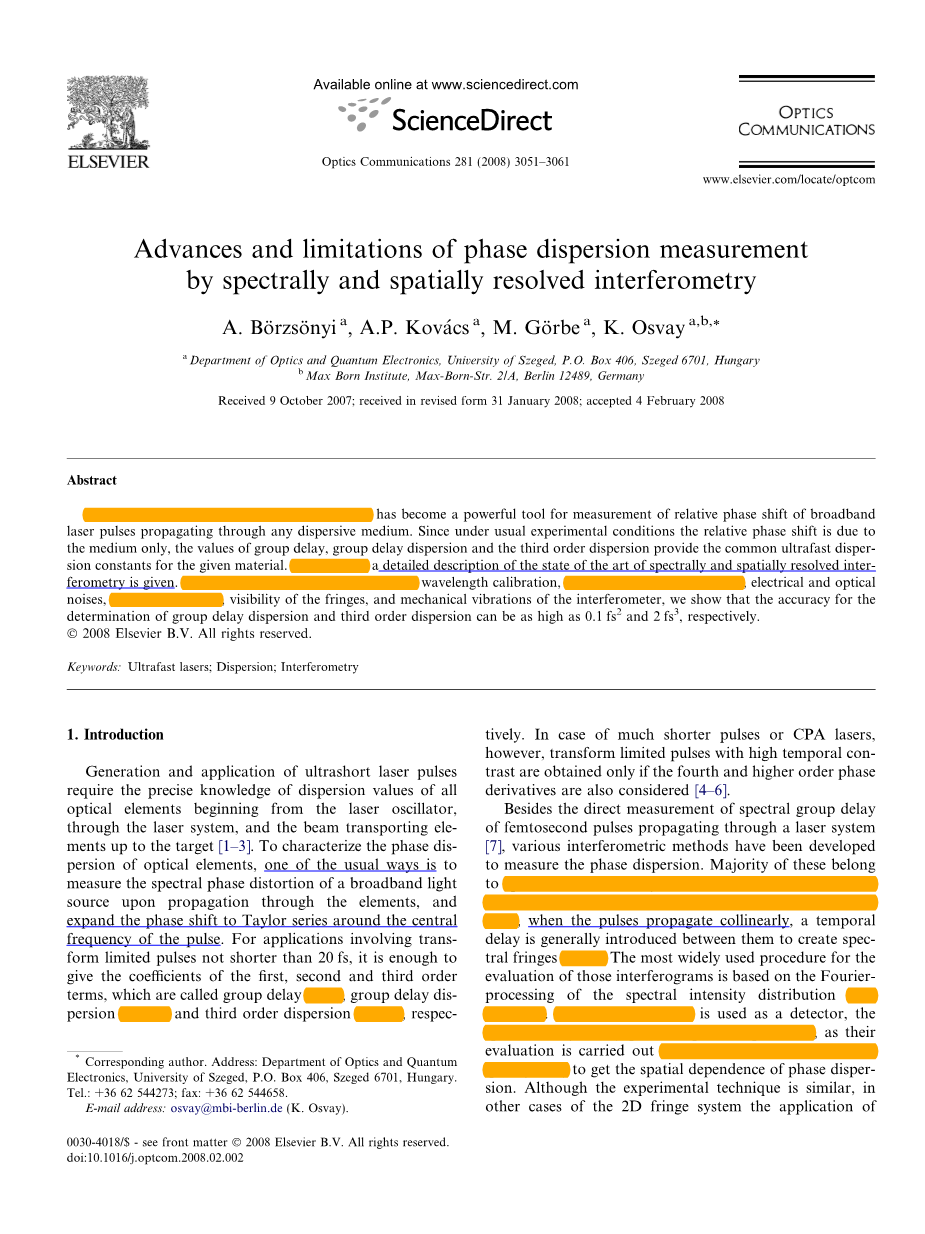 光谱和空间分辨干涉测量已经成为用于测量通过任何色散介质传播的宽带激光脉冲的相对相移的有力工具。因为在一般实验条件下,相对相移只归结于介质,所以群延迟、群延迟色散和三阶色散的值为给定的材料提供了共同的超快的色散常数。本文将详细说明光谱和空间分辨干涉测量这门学科的状态。考虑到波长校准、光源的频宽、电气和光学噪声、弯曲的波阵面、条纹可见度及干涉仪的机械振动的影响,我们将展示群延迟色散和三阶色散的结果分别能达到和的精度。