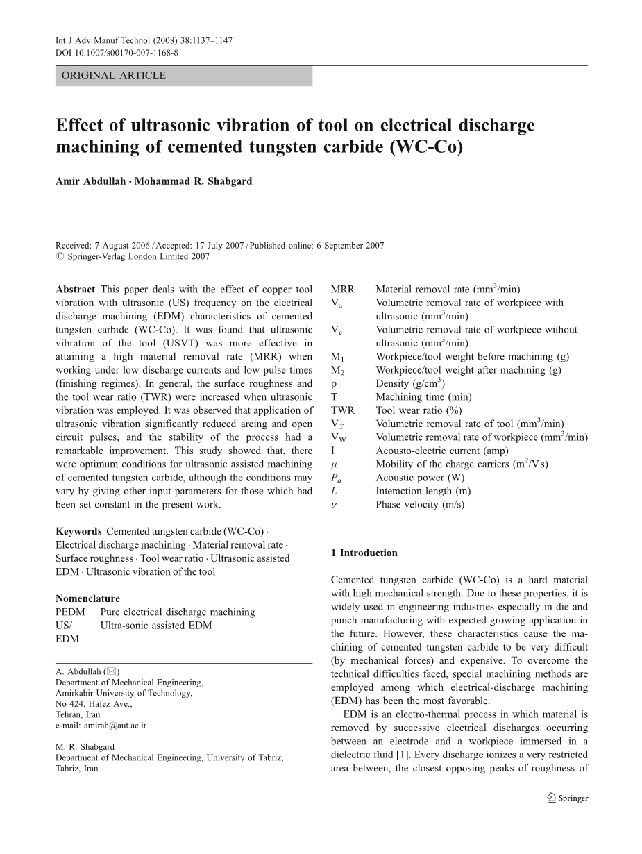 目前的工作是进行超声工具振动对碳化钨硬质合金(WC-Co)电火花加工特性的影响的实验研究。有人指出,超声振动的工具中的应用大幅地提高了材料去除率,虽然它会导致更高的刀具磨损率和表面粗糙度。此外,结果表明,超声波振动的工具显着减少非活跃脉冲,提高了加工过程的稳定性。