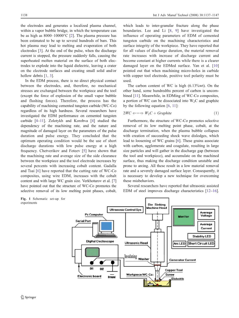 此外,钴基碳化钨的结构促使选择性地去除相对熔点更低的钴,在放电终止,当等离子体泡沫崩溃,随后形成冲击波,从而导致WC晶粒松动[6]。这些晶粒与碳凝聚和凝结,形成大颗粒并且聚集在放电间隙(工具和工件)之间,在工件表面堆积,从而容易产生电弧,使放电条件不稳,。这些因素将降低材料去除率并且严重损坏工件表面层。因此,有必要开发一种新的技术来克服这种现象。根据现有的研究表明,钢超声辅助电火花加工技术提高了放电特性 [12-16]。