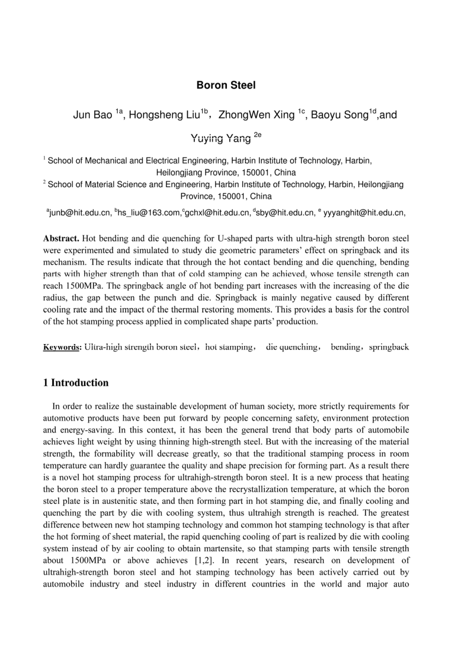 关键词:超高强度硼钢;烫金;淬火;弯曲;弹回