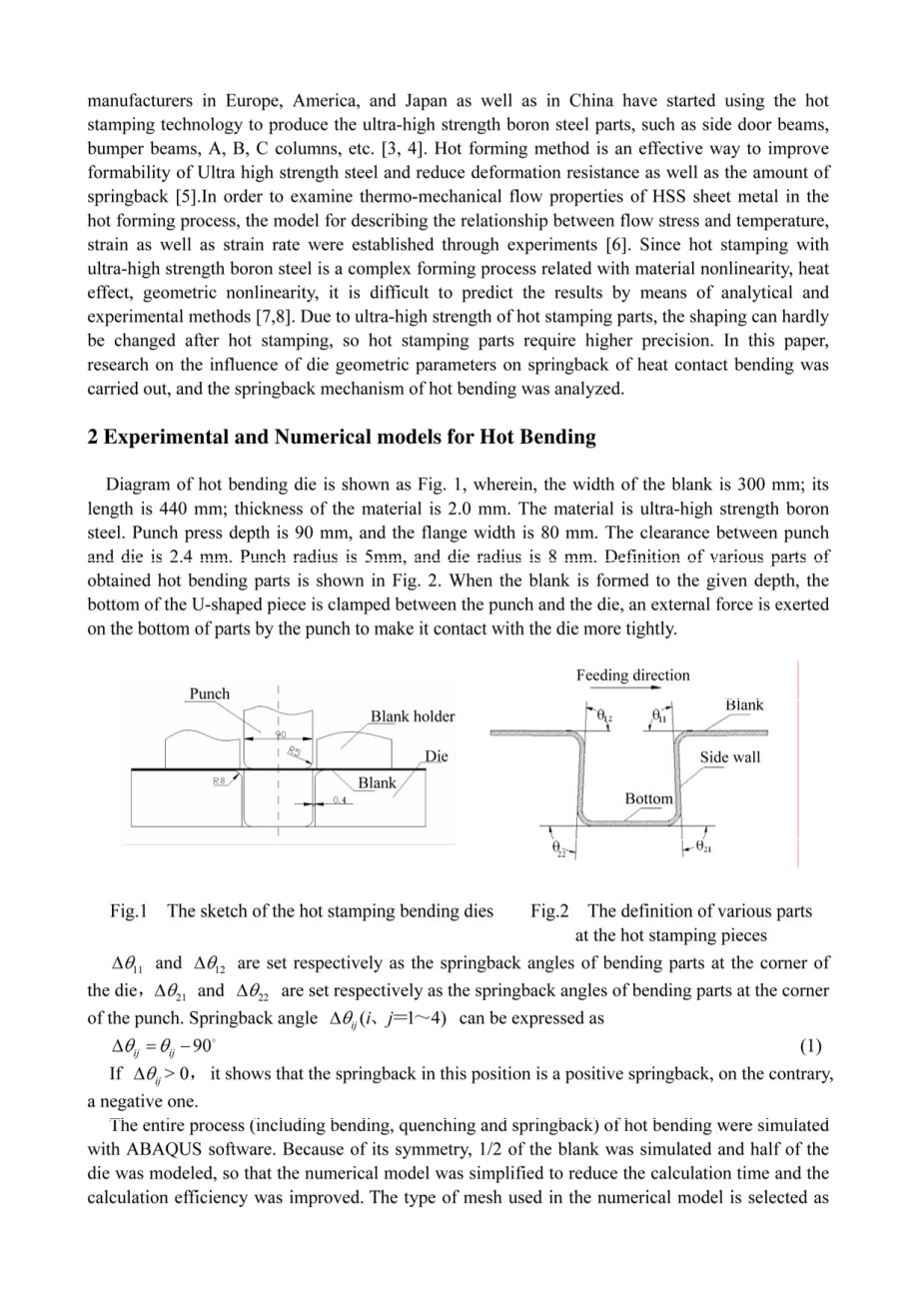 为了实现人类社会的可持续发展,人们对安全,环保和节能问题提出了更严格的汽车产品要求。在这种情况下,汽车车身部件通过使用变薄的高强度钢材实现轻量化是一般趋势。但随着材料强度的增加,成型性将大大降低,使传统的室温冲压过程难以保证成型件的质量和形状精度。因此,对超高强度硼钢进行了新的热冲压工艺。将硼钢加热至高于再结晶温度的适当温度,硼钢板处于奥氏体状态,然后在热冲压模具中形成部分,最后通过模具冷却和冷却部件,冷却系统,达到超强的实力。新型烫印技术与普通烫印技术的最大区别在于,片材热成型后,通过冷却系统的模具实现快速淬火冷却,而不是通过空气冷却获得马氏体,使冲压件与抗拉强度达到1500MPa以上[1,2]。近年来,世界不同国家的汽车工业和钢铁工业以及欧美,日本以及中国的主要汽车制造商都积极开展超高强度硼钢和热冲压技术的开发研究,并且开始使用热冲压技术生产超高强度硼钢部件,如侧门梁,保险杠梁,A,B,C柱等[3,4]。热成型方法是提高超高强度钢的成型性,降低变形抗力以及回弹量的有效方法[5]。为了检验热成型过程中HSS钣金的热机械流动性能,通过实验建立了描述流动应力与温度,应变和应变率之间关系的模型[6]。由于超高强度硼钢的热冲压是与材料非线性,热效应,几何非线性相关的复杂成型工艺,难以通过分析和实验方法预测结果[7,8]。由于热冲压件的超高强度,烫印后的成型几乎不会发生变化,因此热冲压件需要更高的精度。在本文中,对模具几何参数对热接触弯曲回弹的影响进行了研究,分析了热弯曲的回弹机理。