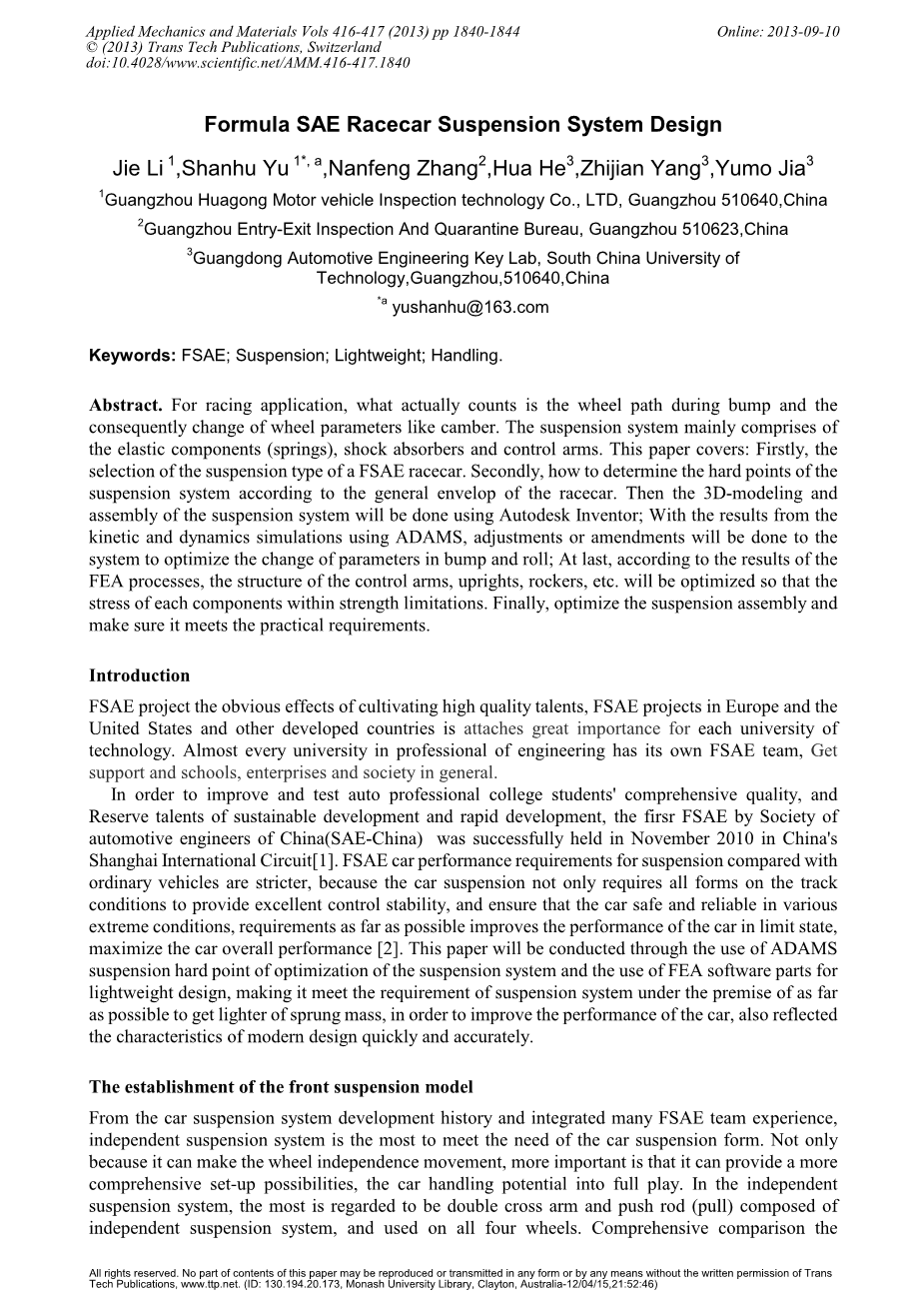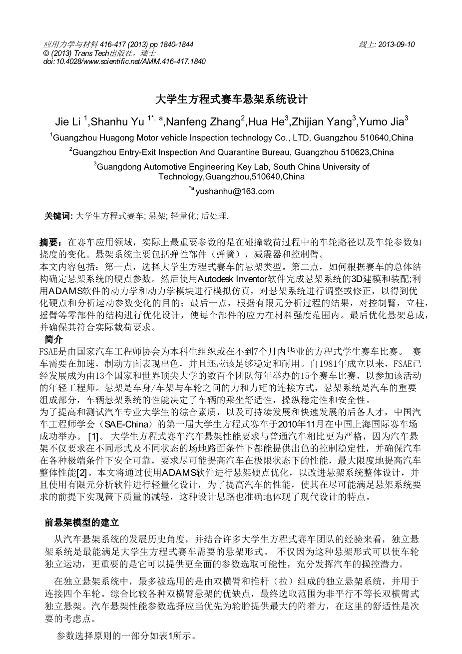 电动方程式赛车悬架结构设计与仿真分析外文翻译资料 2021-12-23 22:08:29 英语原文共 6 页 英语原文共 7 页资料编号:[3835] 原文和译文剩余内容已隐藏,您需要先支付 30元 才能查看原文和译文全部内容!立即支付 发小红书推广免费获取该资料资格。点击链接进入获取推广文案即可: Ai一键组稿 | 降AI率 | 降重复率 | 论文一键排版 PREVIOUS NEXT 您可能感兴趣的文章 流化床包衣造粒过程的监测与控制研究外文翻译资料 一种新颖的旋转流化床包衣细颗粒涂层的方法外文翻译资料 中国城市垃圾的处理和管理外文翻译资料 滤袋、气旋、和湿式除尘方法在真空吸尘器中的比较外文翻译资料 一个灵活的模型辗环机设计外文翻译资料 带有柔性转子的主动电磁轴承系统的识别外文翻译资料 柔性阻尼支承下转子振动特性实验外文翻译资料 MapReduce:超大集群上的数据简化处理外文翻译资料 垂直循环式立体车库的停车与乘车调度优化外文翻译资料 高灵敏度、高稳定性的自温度补偿电涡流位移传感器外文翻译资料