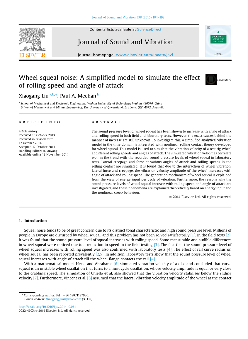 在现场检测和实验室试验中,车轮啸叫的声压级都随着冲角和滚动速度的增大而增大。然而,增大方式背后的确切原因仍不清楚。为了研究这一点, 将一个简化的时域分析振动模型与用于研究车轮啸叫的非线性滚动接触理论结合起来。该模型用于模拟试验台车轮在不同滚动速度和冲角下的振速。在实验室试验中,模拟振速和所记录的车轮啸叫声压级的变化趋势呈现良好的相关性。模拟了在滚动接触中的各种冲角和滚动速度下的侧向蠕滑力。研究发现,由于车轮振动、侧向力和蠕滑的相互作用,轮毂的速度振幅随着冲角和滚动速度的增大而增大。从每个振动周期的能量输入的角度,解释了车轮啸叫的产生机理。此外,探索了车轮啸叫的声压级随着滚动速度和冲角增大而增大的原因,并且从能量输入和非线性蠕变行为角度出发,从理论上,解释了该现象。