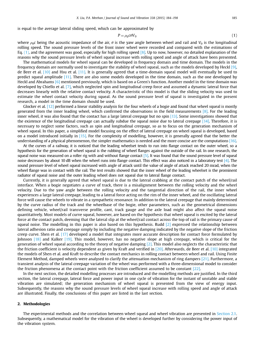 诸多实验测试与实际经验表明,车轮轮毂噪声的声压级随冲角与滚动速度的增大而增大。然而,这种增长现象背后的确切原因仍然未知。为了研究这个问题,我们将简化时域模型的振动分析与车轮噪声非线性滚动接触理论相结合。该模型模拟的是试验机车轮在不同的滚动速度和冲角下的振动速度。模拟的振动速度,在实验室条件下,很好的拟合了已记录的车轮噪声声压级的增长趋势。滚动接触中不同冲角和滚动速度下的横向蠕变和力也得到了拟合。研究发现,由于车轮振动、横向力与横向蠕变的相互作用,车轮的振动速度的振幅随冲角和滚动速度的增长而增长。我们的研究立足于从每个振动周期的能量输入的角度,来解释车轮轮毂噪声的产生机理。并且,在基于能量输入和非线性蠕变行为的理论基础上解释的车轮噪声声压级随滚动速度和冲角的增大而增大的原因的。