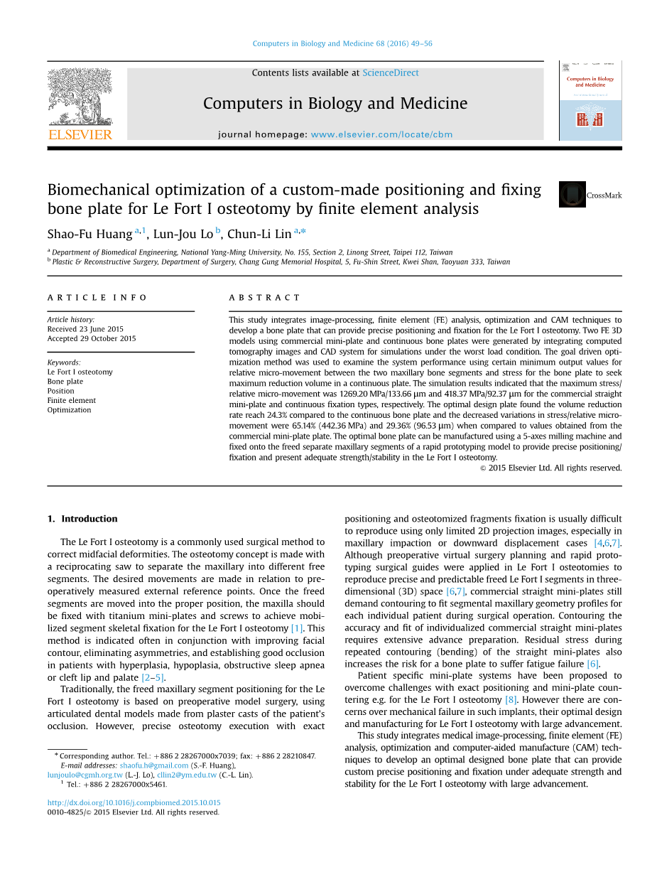 摘要:本研究结合影像处理、有限元分析、最佳化与计算机辅助制造技术,开发出一种能为Le Fort I截骨术提供精确定位与固定之骨板。将计算机断层扫描图像与计算机辅助设计(CAD)系统相结合,生成了两种商用微型钢板和连续骨钢板的有限元三维模型,用于最劣载荷条件下的仿真。采用目标驱动优化方法,通过上颌骨两段间相对微运动的一定最小输出值和骨板应力,来检测系统性能,以寻求连续板的最大减容量。模拟结果表明,商用直形微型钢板和连续固定钢板的最大应力/相对微位移分别为1269.20MPa/133.66mu;m和418.37MPa/92.37mu;m。优化设计板发现,与连续骨板相比,体积减小率达到24.3%,与商用微型板相比,应力/相对微运动的减小变化分别为65.14%(442.36 MPa)和29.36%(96.53mu;m)。最佳骨板可使用5轴铣床制造,并固定在快速成型模型的分离上颌节段上,以提供精确的定位/固定,并在Le Fort I截骨术中提供足够的强度/稳定性。