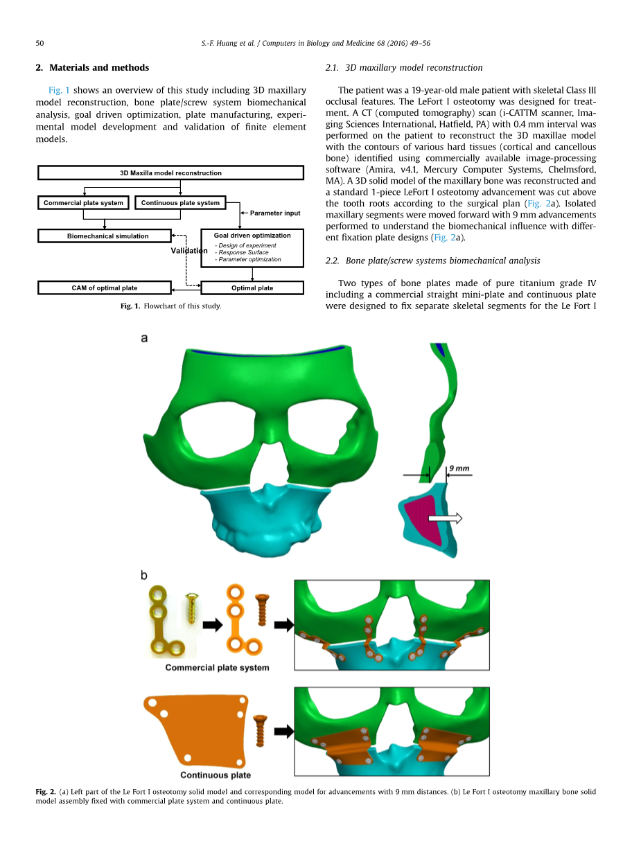 传统上,Le Fort I截骨术的上颌游离节段定位是基于术前模型手术,使用由患者咬合石膏铸型制成的关节牙模型。然而,精确的截骨术和截骨片固定通常很难用有限的二维投影图像重现,尤其是在上颌嵌压或向下移位的情况下。尽管在Le Fort I骨切除术中应用了术前虚拟手术规划和快速原型化手术指南,以在三维(3D)空间中复制精确和可预测的游离Le Fort I骨段,但商用直形微型钢板仍然需要轮廓化,以适合每个患者的上颌节段几何轮廓。环形外科手术。个性化的商用直型微型钢板的精度和配合需要大量的预先准备。小直钢板反复弯曲时的残余应力也增加了骨板疲劳失效的风险。