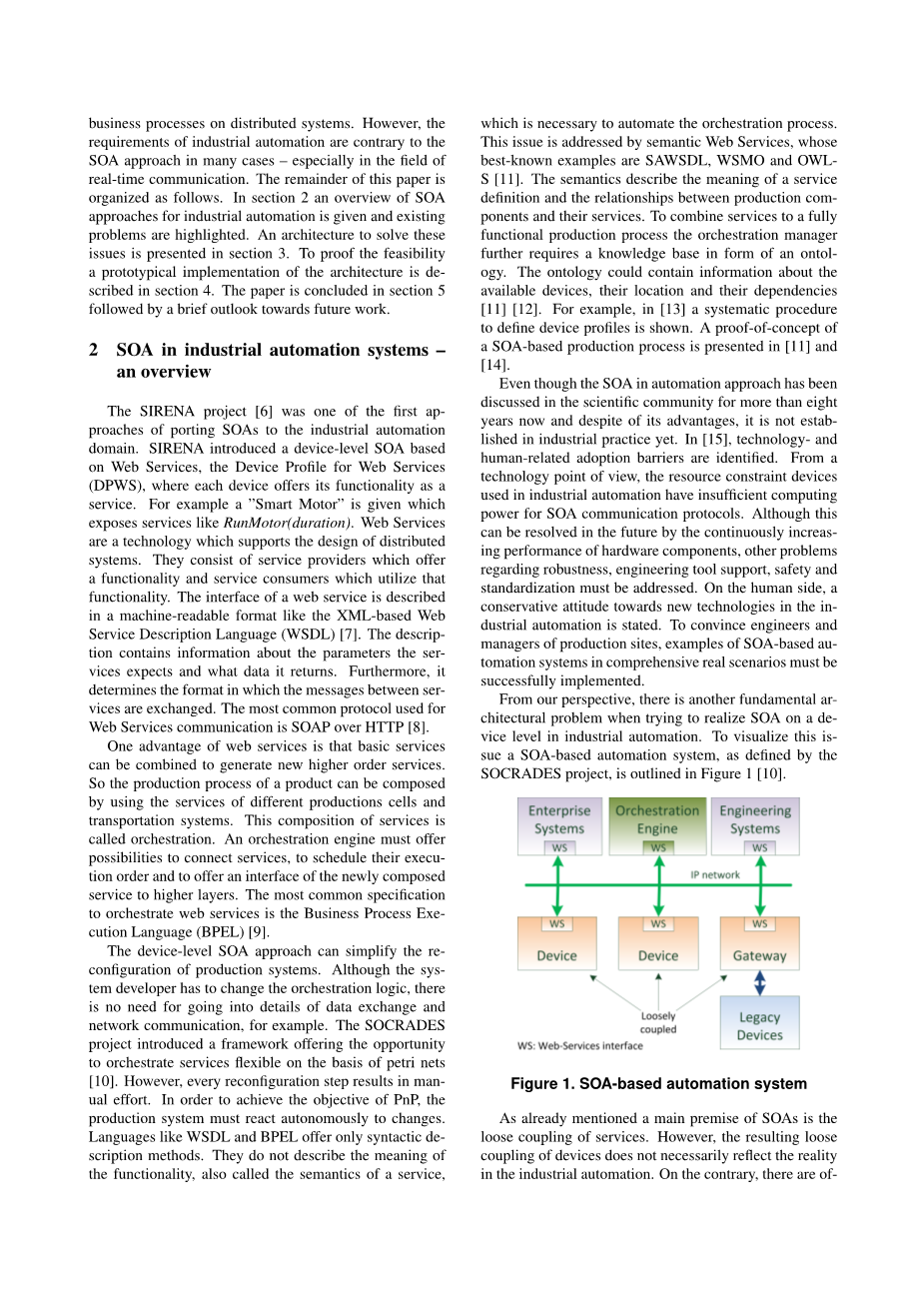 从我们的角度来看,当试图在工业自动化的设备级别上实现SOA时,还有另一个基本的体系结构问题。为了可视化这个问题,图1[10]中概述了一个基于SOA的自动化系统(由SOCRADES项目定义)。