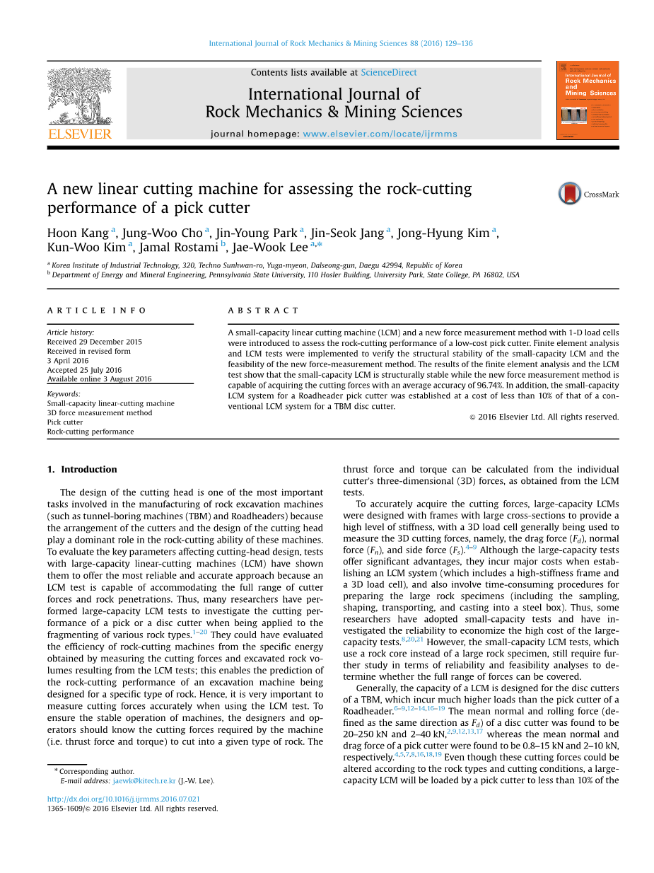 韩国建筑技术研究所(KICT)的LCM已被用于研究刀具作用力和性能。它能够使用3D称重传感器在切割机上获得切削力。Cho等人在各种切削条件下进行了LCM测试,以获得韩国花岗岩岩石TBM圆盘铣刀的切削性能。 此外,Choi等人进行了线性切割试验,以估计在不同角度和倾斜角度条件下锥形截齿的性能。