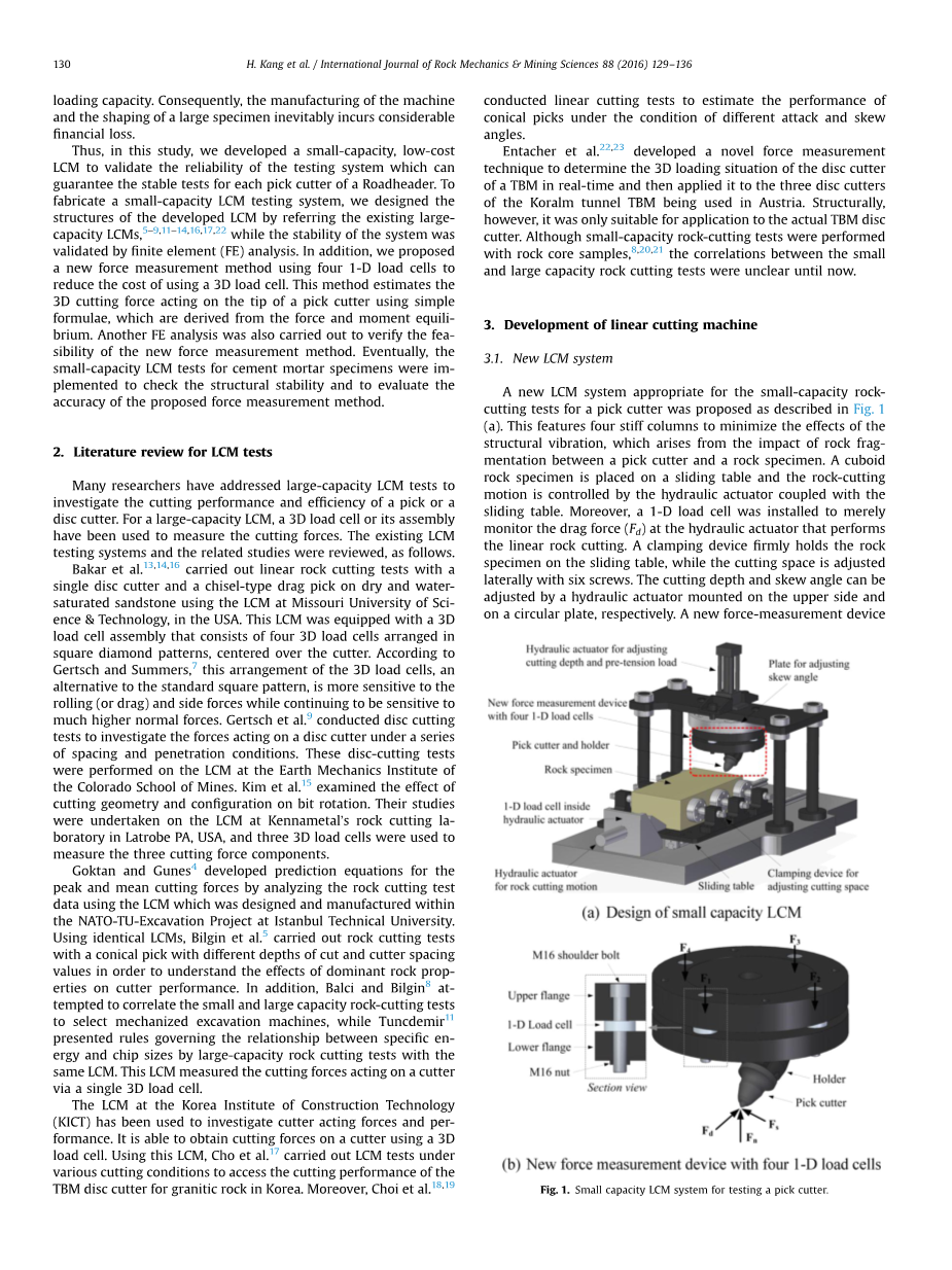 许多研究人员已经解决了大容量LCM测试,以研究镐或圆盘切割机的切割性能和效率。 对于大容量LCM,已使用3D称重传感器或其组件来测量切削力。 对现有的LCM测试系统和相关研究进行了审查,如下所述。