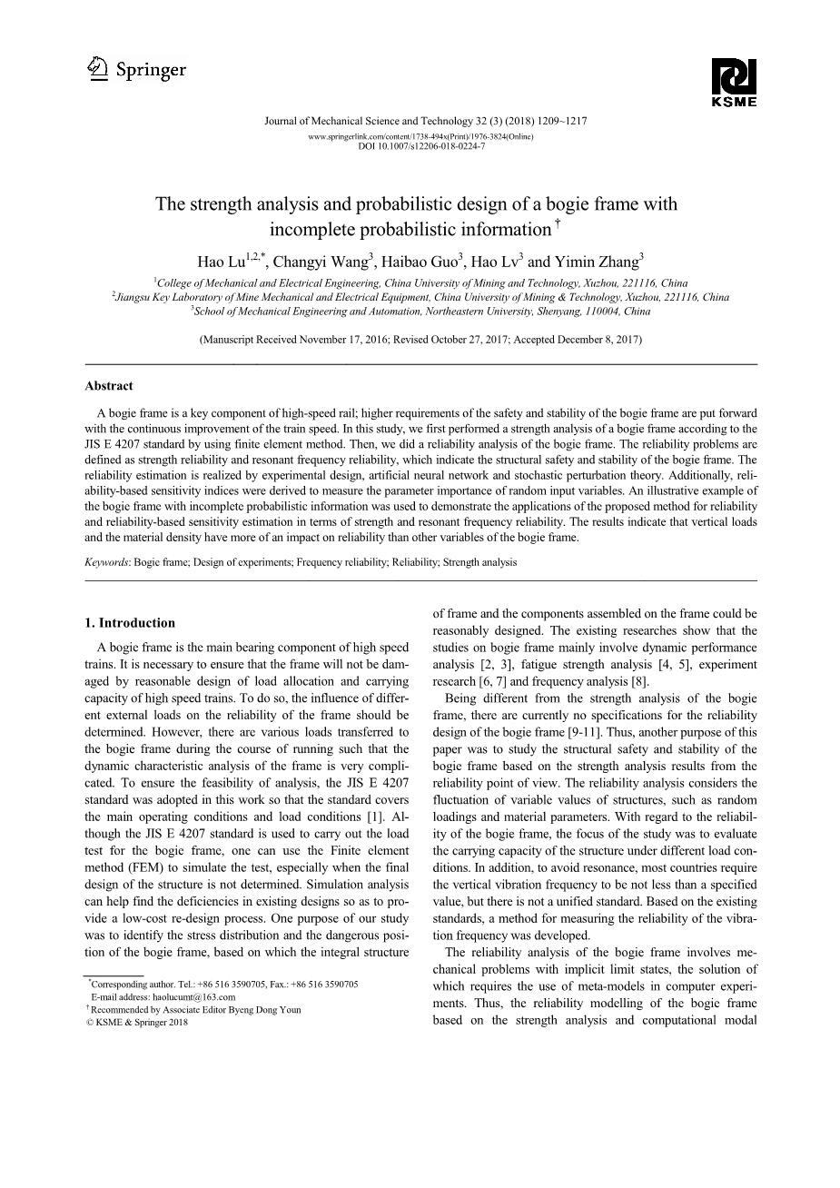 我们的目标是对转向架构架进行强度分析,建立可靠性评估程序,以保证转向架构架的可靠性和稳定性。转向架构架的有关估计是在规定的载荷条件下进行的。这项工作的新颖之处在于转向架构架的强度和模态分析以及相应的可靠性分析。采用四阶矩法、随机摄动理论和神经网络相结合的方法,实现了强度和谐振频率的可靠度分析。在可靠性分析的基础上,建立了基于可靠性的灵敏度模型。本文提出的分析方法可以看作是传统强度分析方法的扩展。